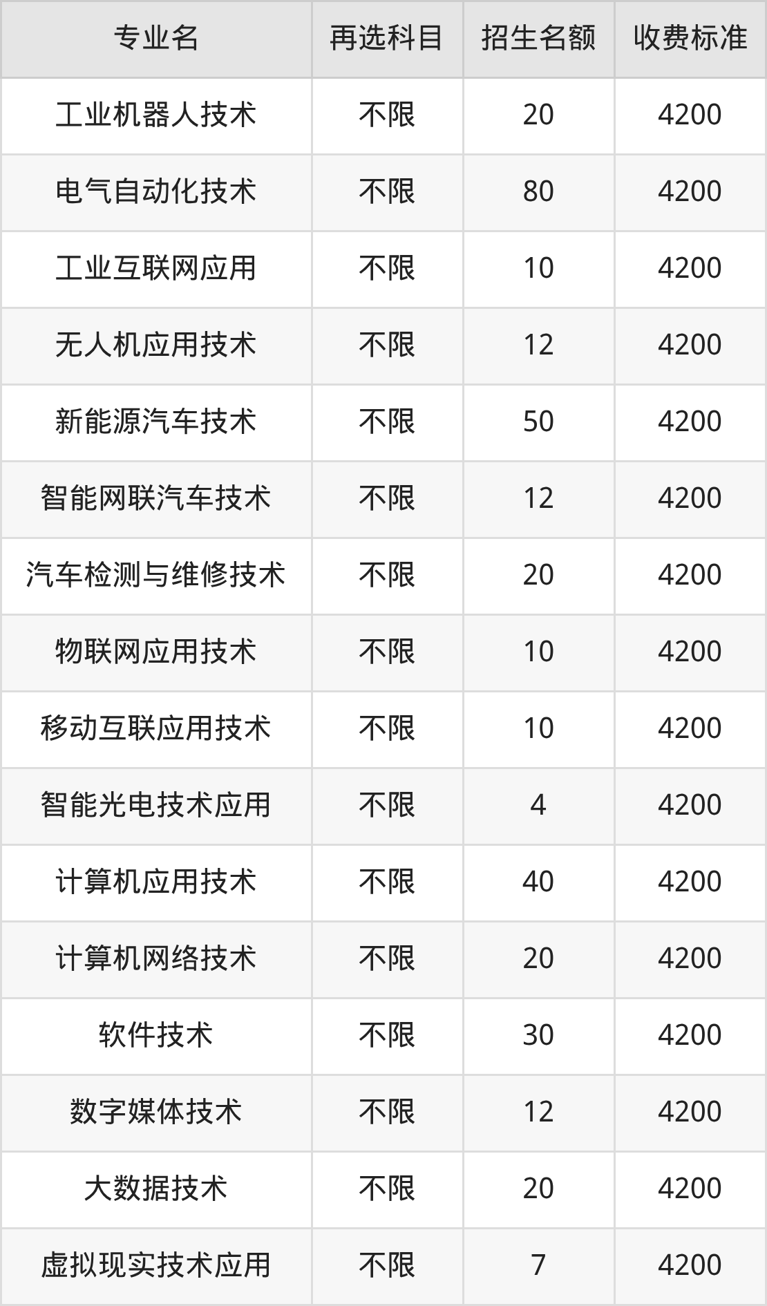 许昌电气职业学院在历史组高职专科批招生的各个专业,每年的学费是3700元-4200元。招生人数最多的专业是机电一体化技术,2025年招80人,学费是4200元。