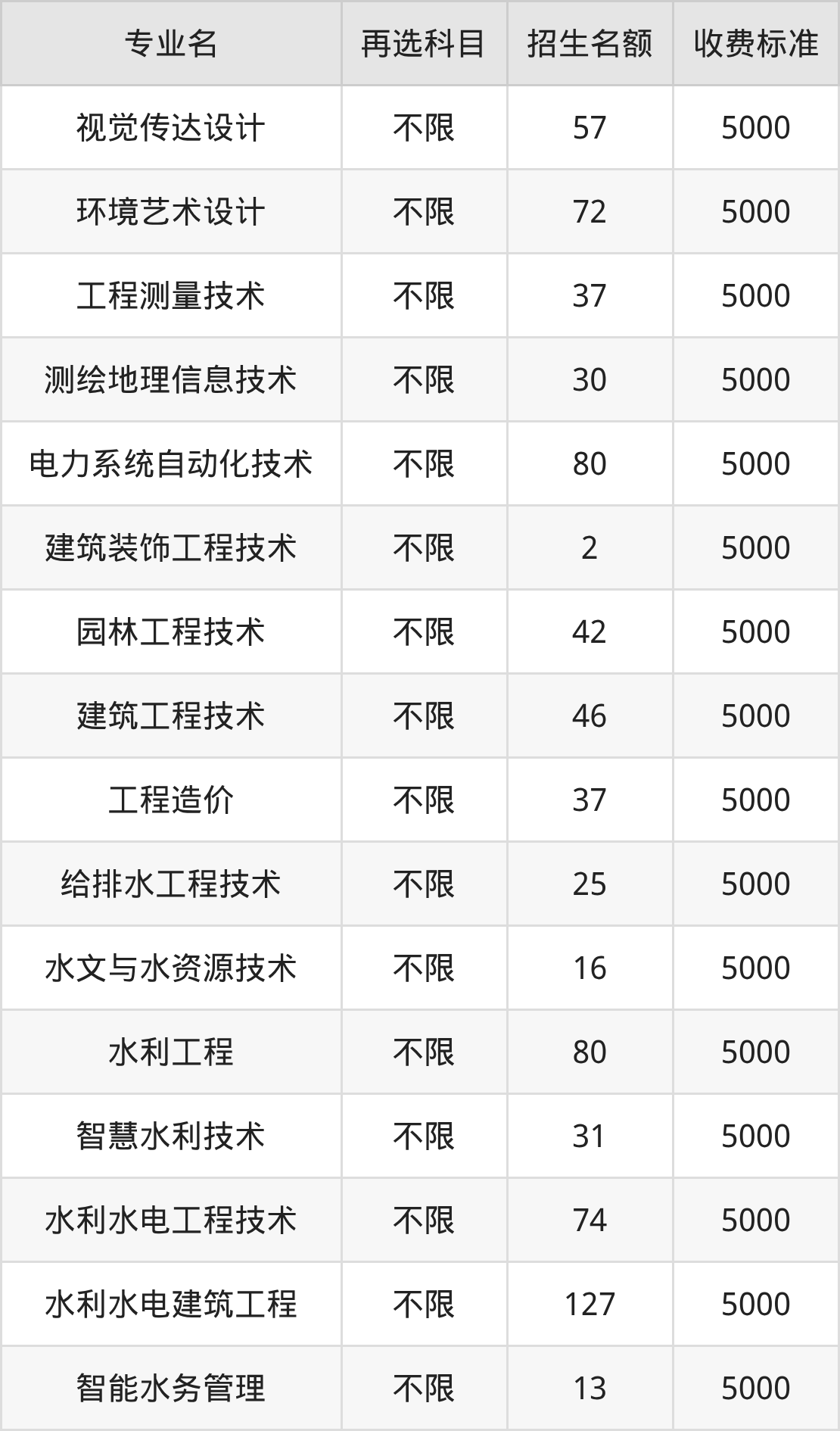 江西水利职业学院在历史组高职专科批招生的各个专业,每年的学费是5000元-12000元。招生人数最多的专业是水利水电建筑工程,2025年招127人,学费是5000元。