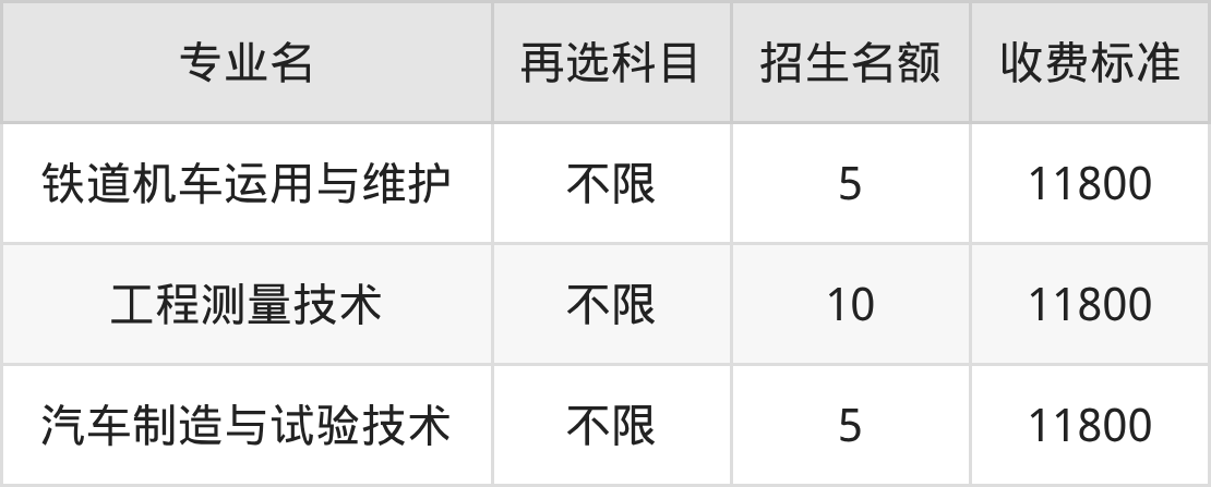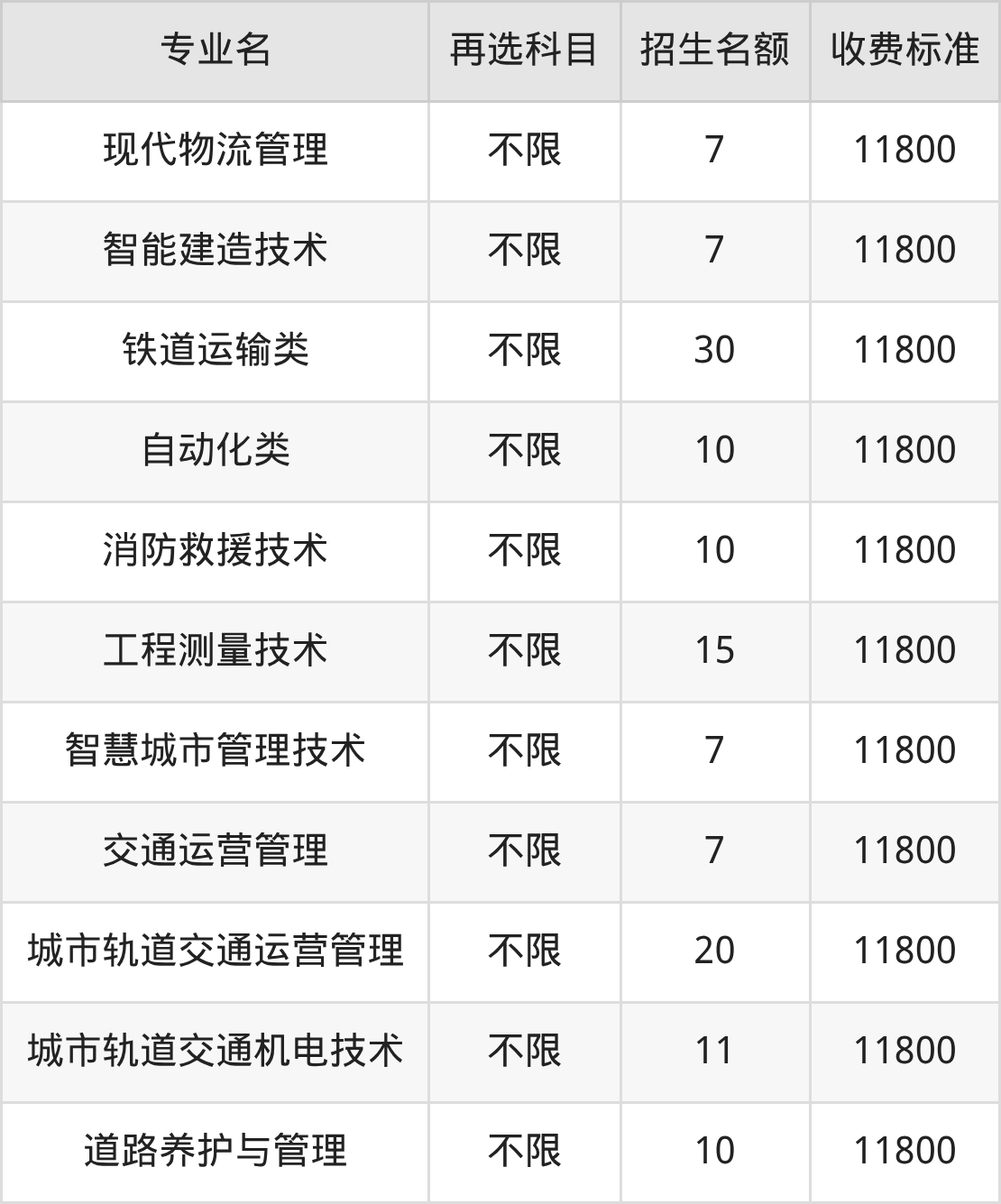 重庆交通职业学院在历史组专科提前批招生的各个专业,每年的学费是11800元。招生人数最多的专业是工程测量技术,2025年招10人,学费是11800元。