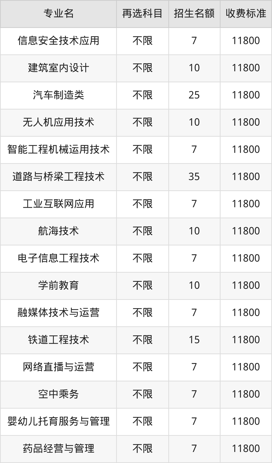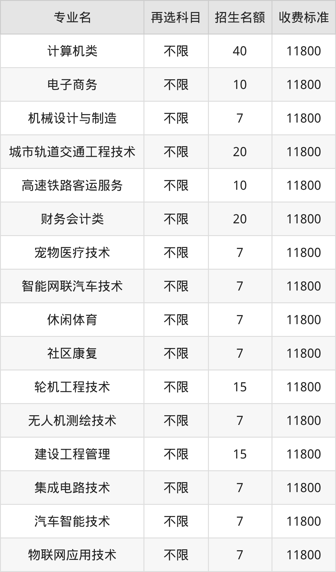 重庆交通职业学院在历史组高职专科批招生的各个专业,每年的学费是11800元。招生人数最多的专业是计算机类,2025年招40人,学费是11800元。