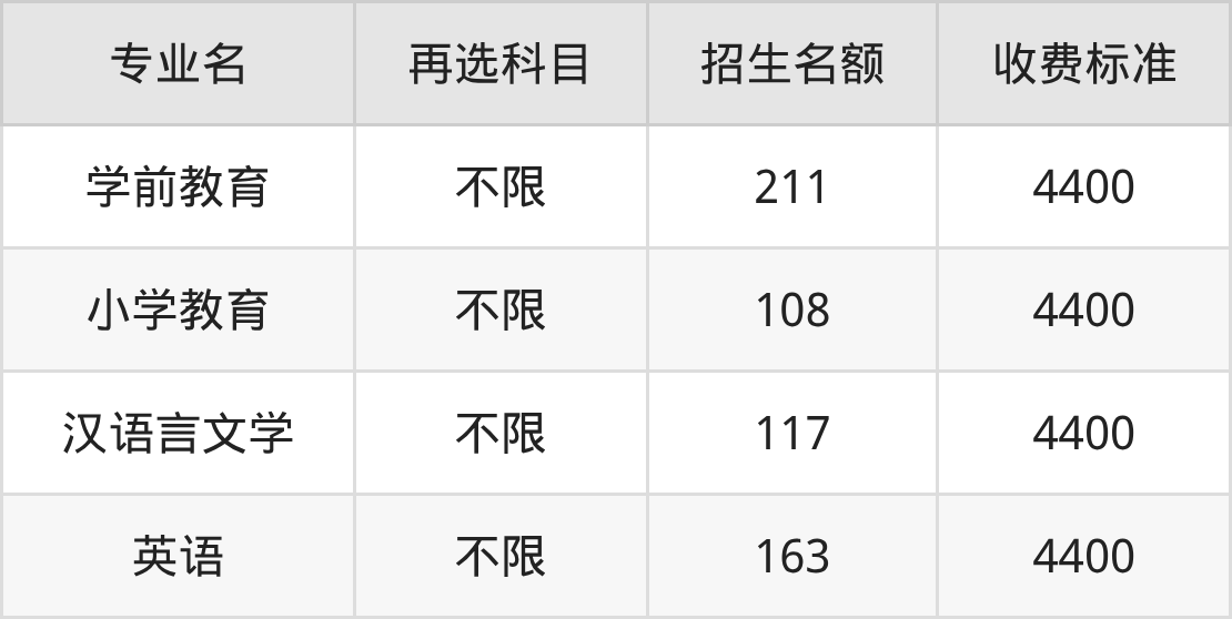 朝阳师范学院在历史组本科批招生的各个专业,每年的学费是4400元。招生人数最多的专业是学前教育,2025年招211人,学费是4400元。