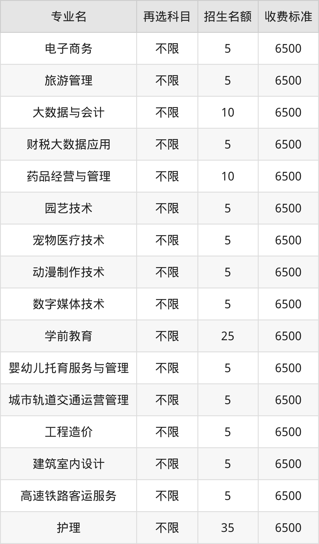 西安职业技术学院在历史组高职专科批招生的各个专业,每年的学费是6500元。招生人数最多的专业是护理,2025年招35人,学费是6500元。