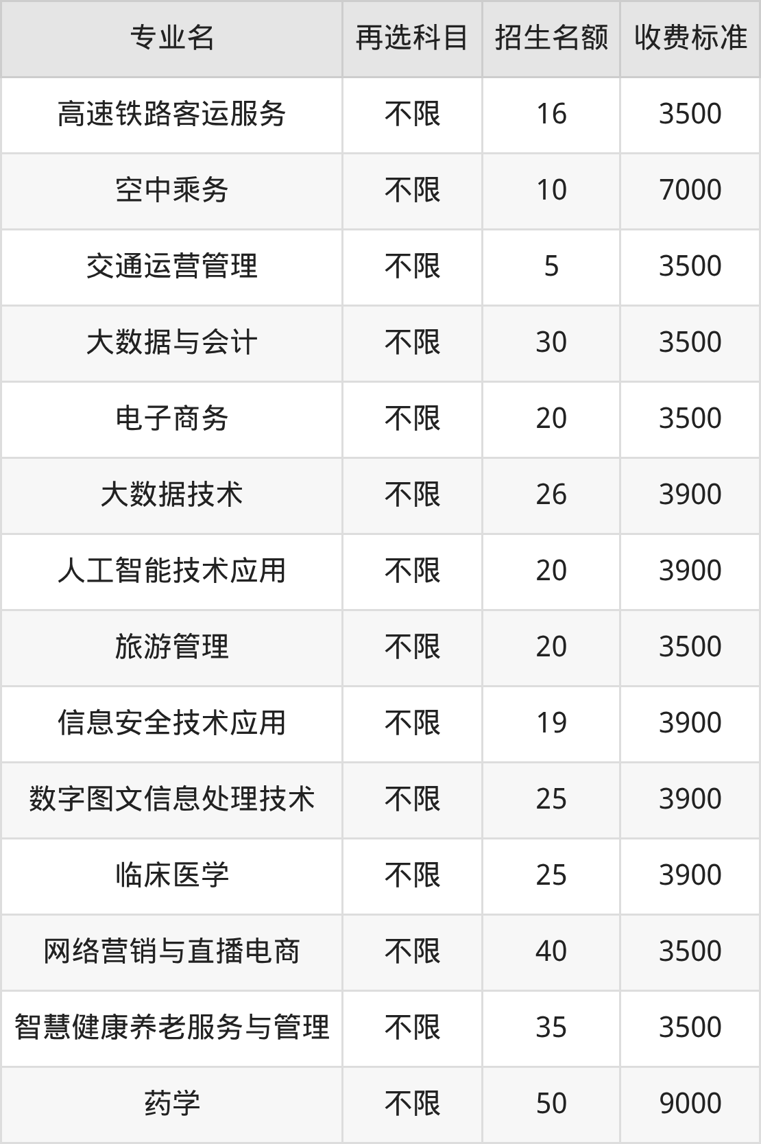 | 高职专科批 | 历史 | 高速铁路客运服务 | 16 |