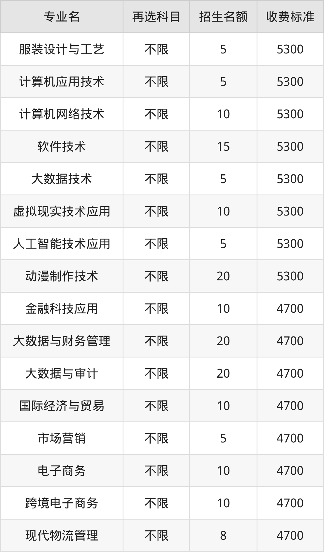 苏州职业技术大学在历史组专科批招生的各个专业,每年的学费是4700元-12800元。招生人数最多的专业是动漫制作技术,2025年招20人,学费是5300元。
