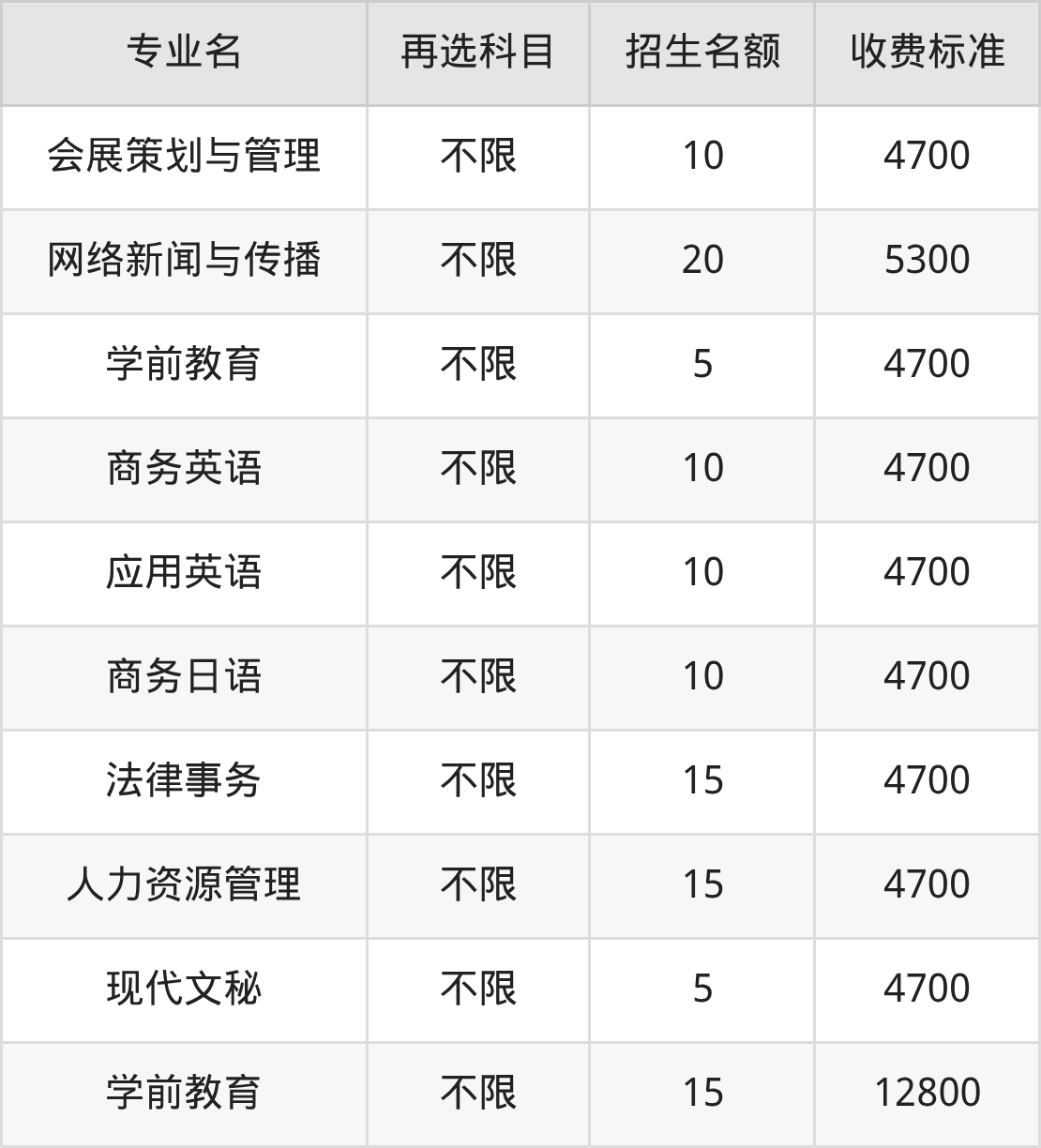 | 专科批 | 历史 | 会展策划与管理 | 10 |