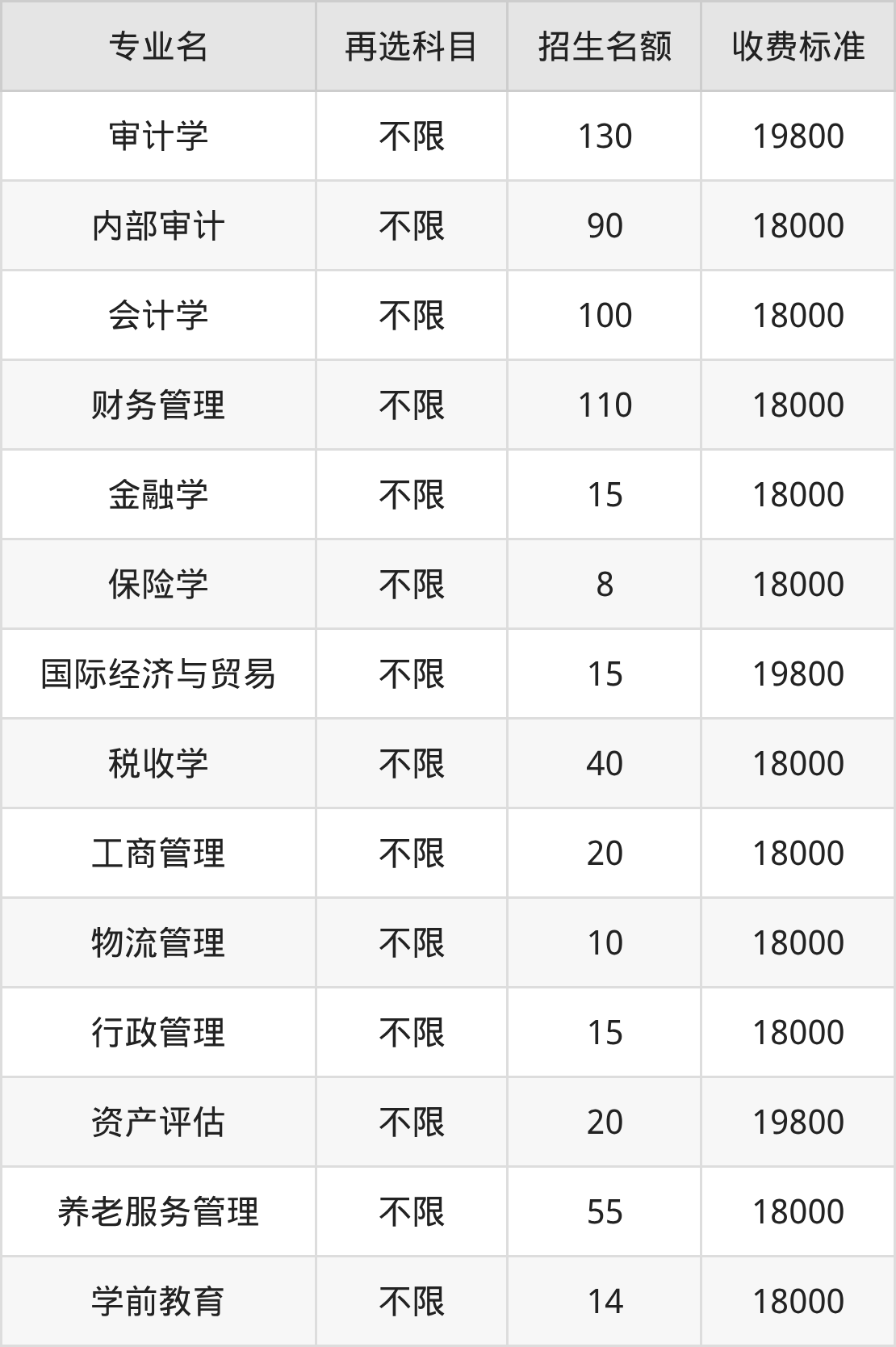 南京审计大学金审学院在历史组本科批招生的各个专业,每年的学费是18000元-19800元。招生人数最多的专业是审计学,2025年招130人,学费是19800元。