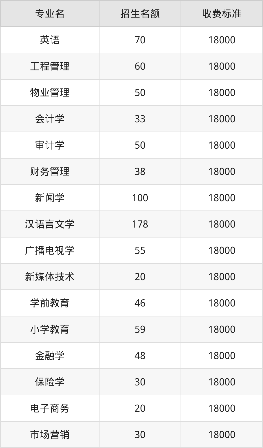 内蒙古鸿德文理学院在文科本科二批招生的各个专业,每年的学费是18000元-21000元。招生人数最多的专业是汉语言文学,2024年招178人,学费是18000元。