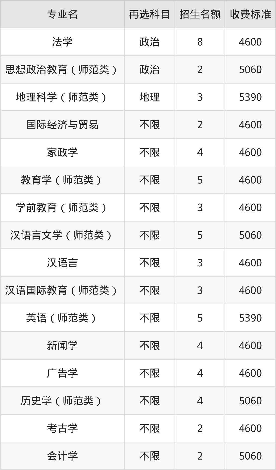 河北师范大学在历史组本科提前批B招生的各个专业,每年的学费是4600元-5390元。招生人数最多的专业是法学,2025年招8人,学费是4600元。