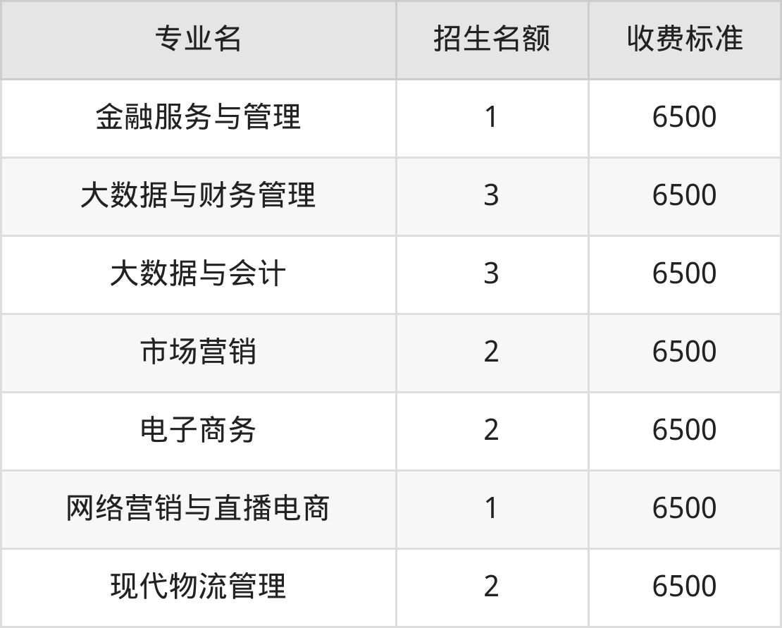 陕西邮电职业技术学院在文科高职专科批招生的各个专业,每年的学费是6500元。招生人数最多的专业是大数据与财务管理,2024年招3人,学费是6500元。