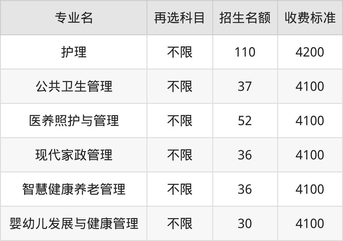 贵阳康养职业大学在历史组本科批招生的各个专业,每年的学费是4100元-4200元。招生人数最多的专业是护理,2025年招110人,学费是4200元。