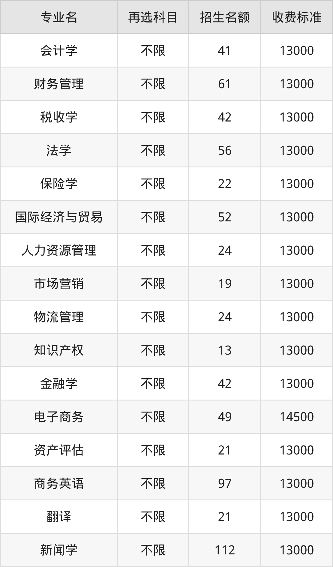 江西财经大学现代经济管理学院在历史组本科批招生的各个专业,每年的学费是13000元-14500元。招生人数最多的专业是新闻学,2025年招112人,学费是13000元。