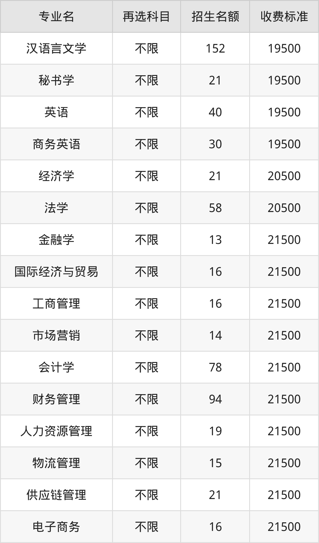 湘潭理工学院在历史组本科批招生的各个专业,每年的学费是19500元-23500元。招生人数最多的专业是汉语言文学,2025年招152人,学费是19500元。