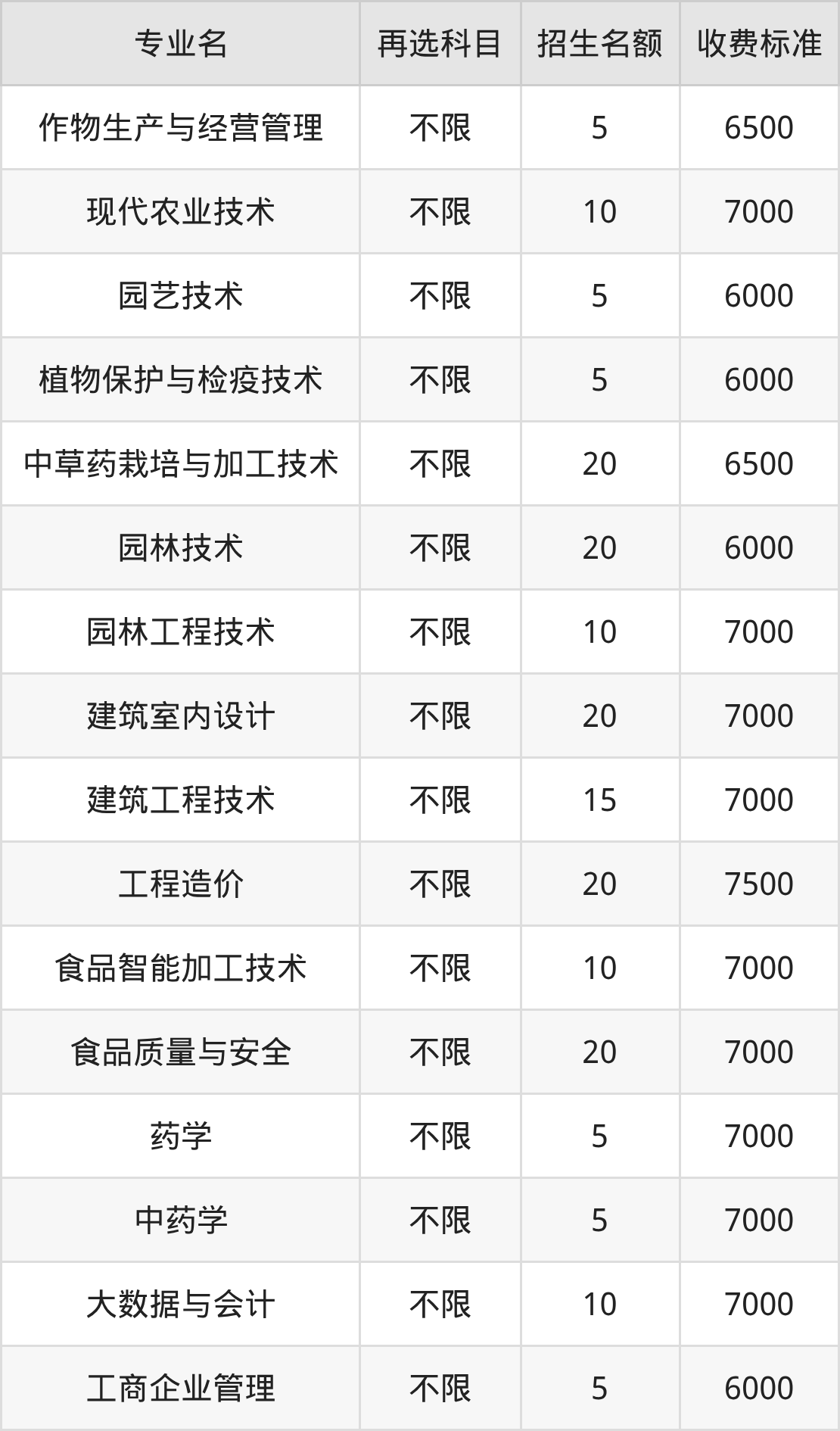 广西农业职业技术大学在历史组高职高专批招生的各个专业,每年的学费是6000元-7500元。招生人数最多的专业是中草药栽培与加工技术,2025年招20人,学费是6500元。