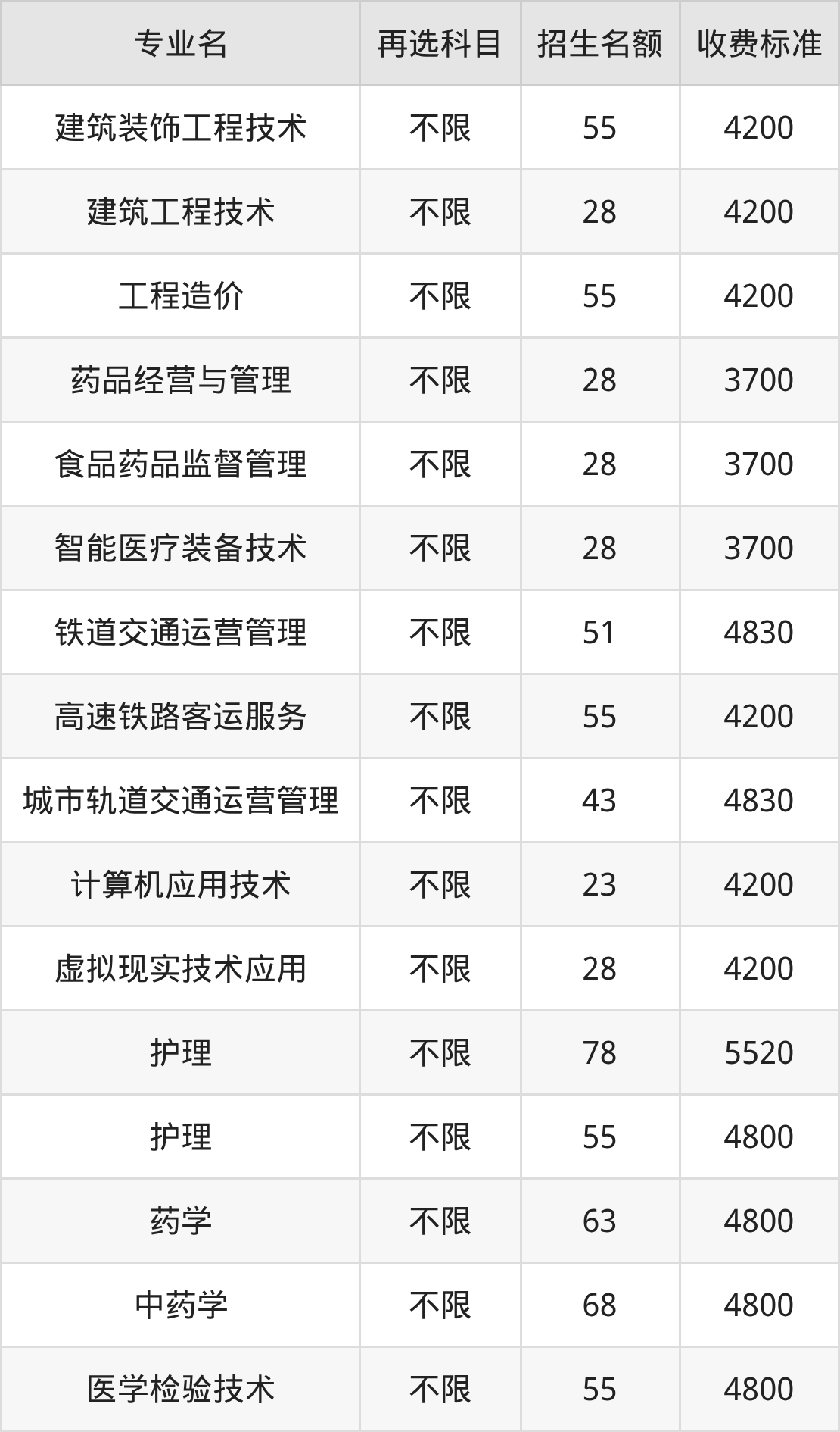 郑州铁路职业技术学院在历史组高职专科批招生的各个专业,每年的学费是3700元-5520元。招生人数最多的专业是护理,2025年招78人,学费是5520元。