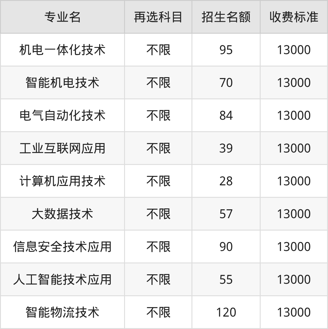 信阳科技职业学院在历史组高职专科批招生的各个专业,每年的学费是13000元。招生人数最多的专业是智能物流技术,2025年招120人,学费是13000元。