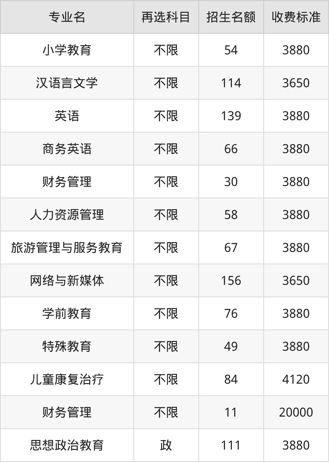 豫章师范学院在历史组本科批招生的各个专业,每年的学费是3650元-20000元。招生人数最多的专业是网络与新媒体,2025年招156人,学费是3650元。