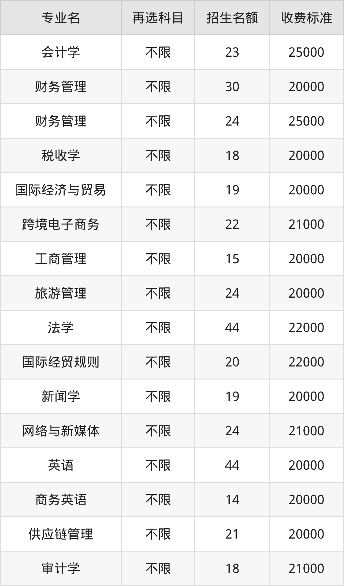 武汉学院在历史组本科批招生的各个专业,每年的学费是20000元-25000元。招生人数最多的专业是金融学,2025年招45人,学费是21000元。