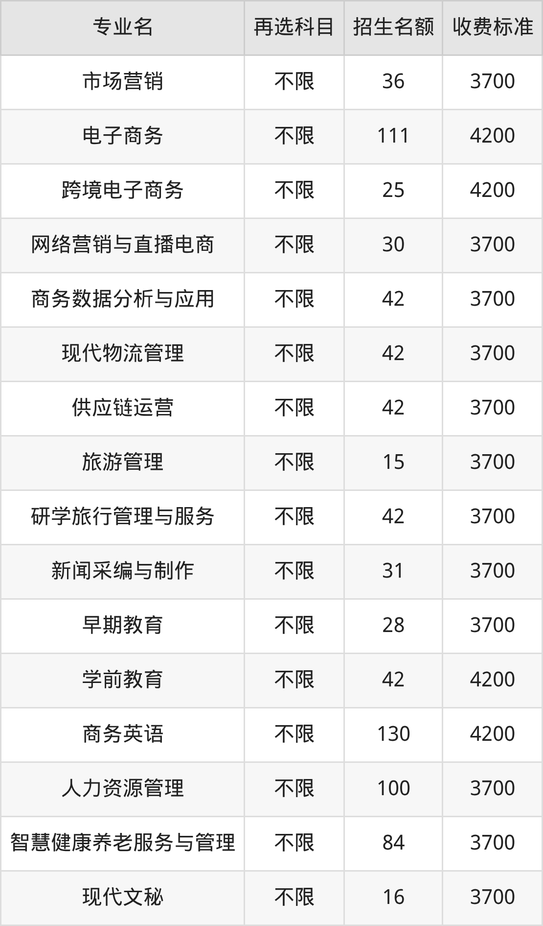 河南经贸职业学院在历史组高职专科批招生的各个专业,每年的学费是3700元-4800元。招生人数最多的专业是商务英语,2025年招130人,学费是4200元。