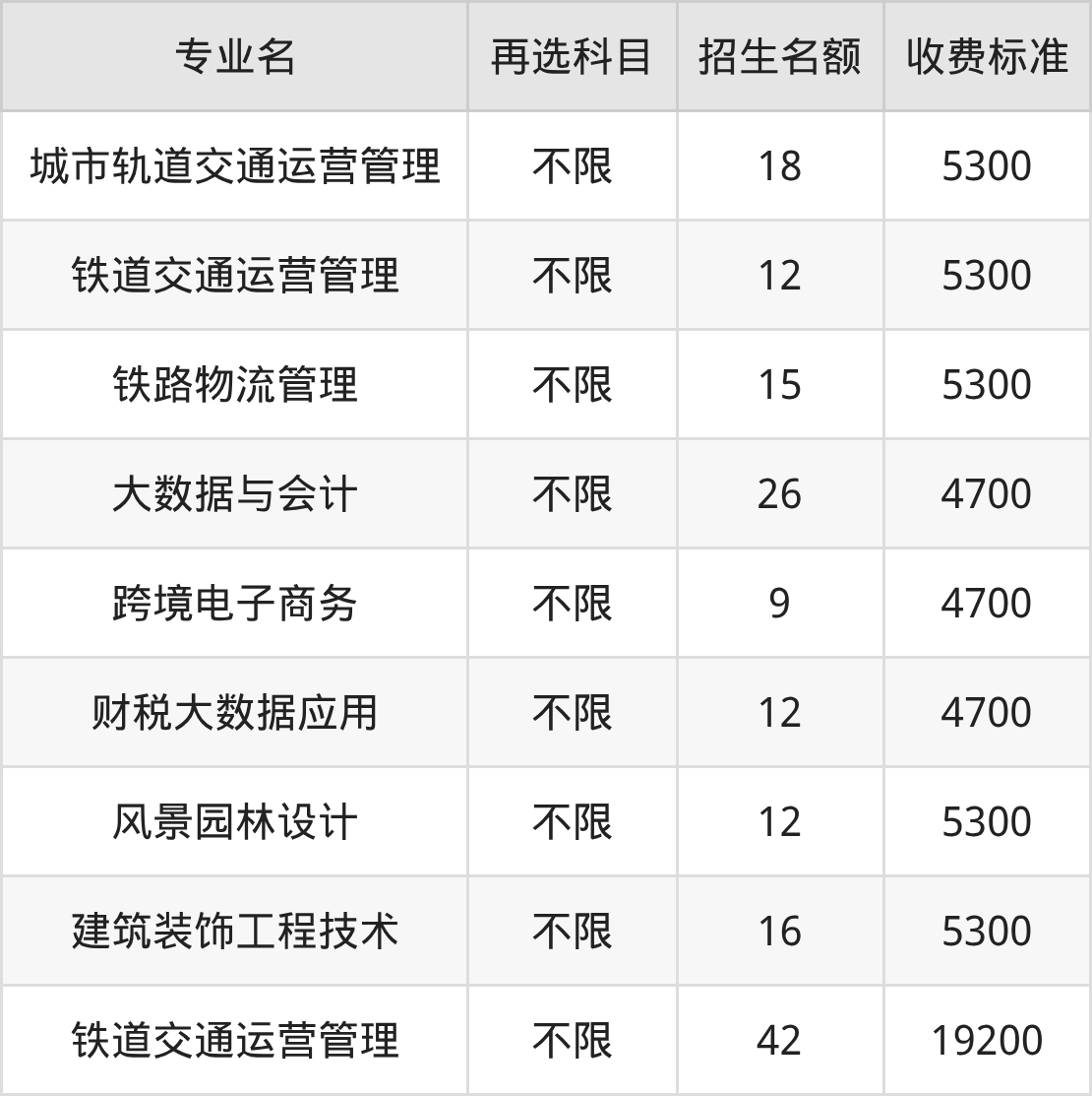 | 专科批 | 历史 | 铁道交通运营管理 | 42 |