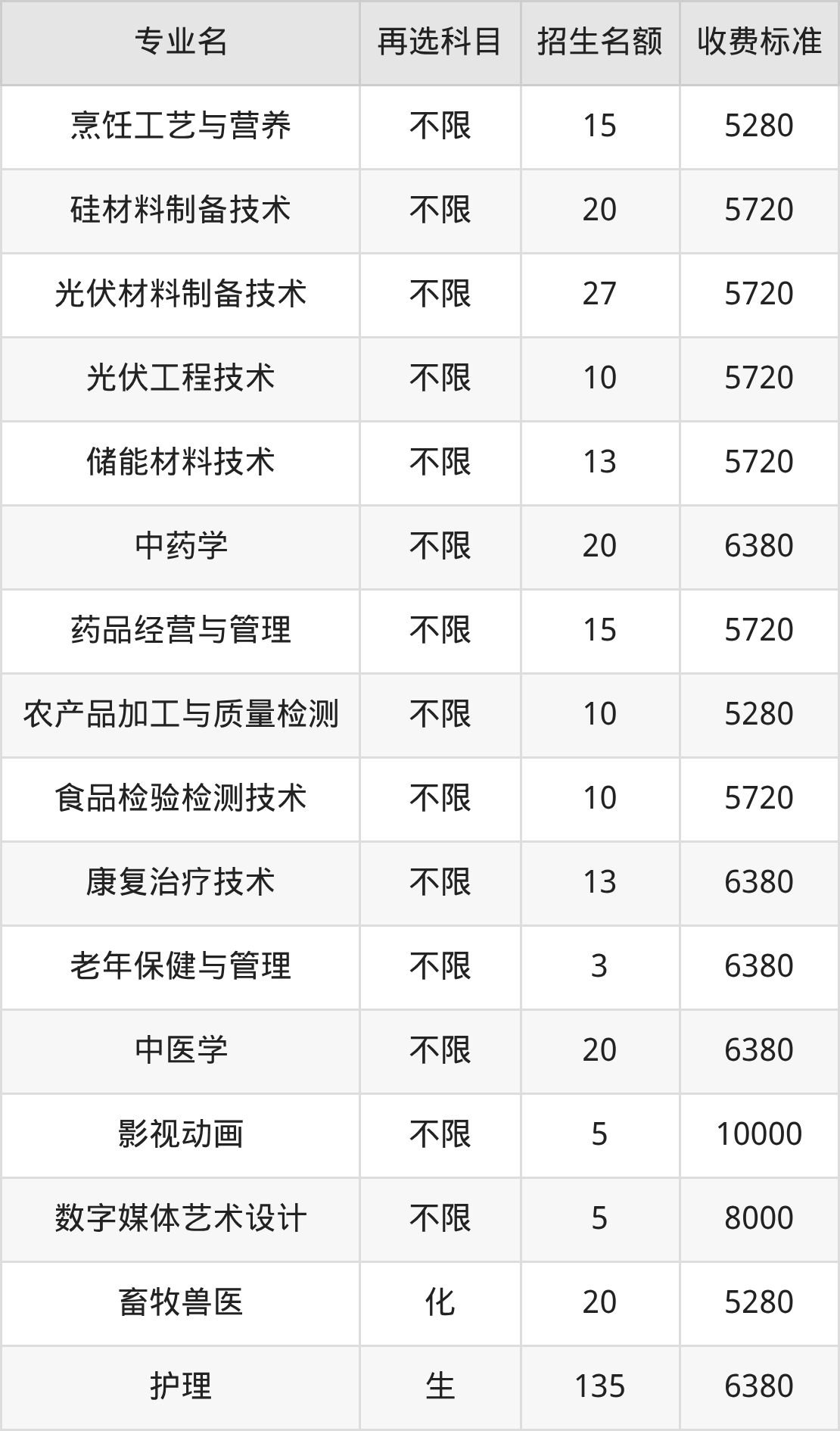 | 高职专科批 | 历史 | 烹饪工艺与营养 | 15 |