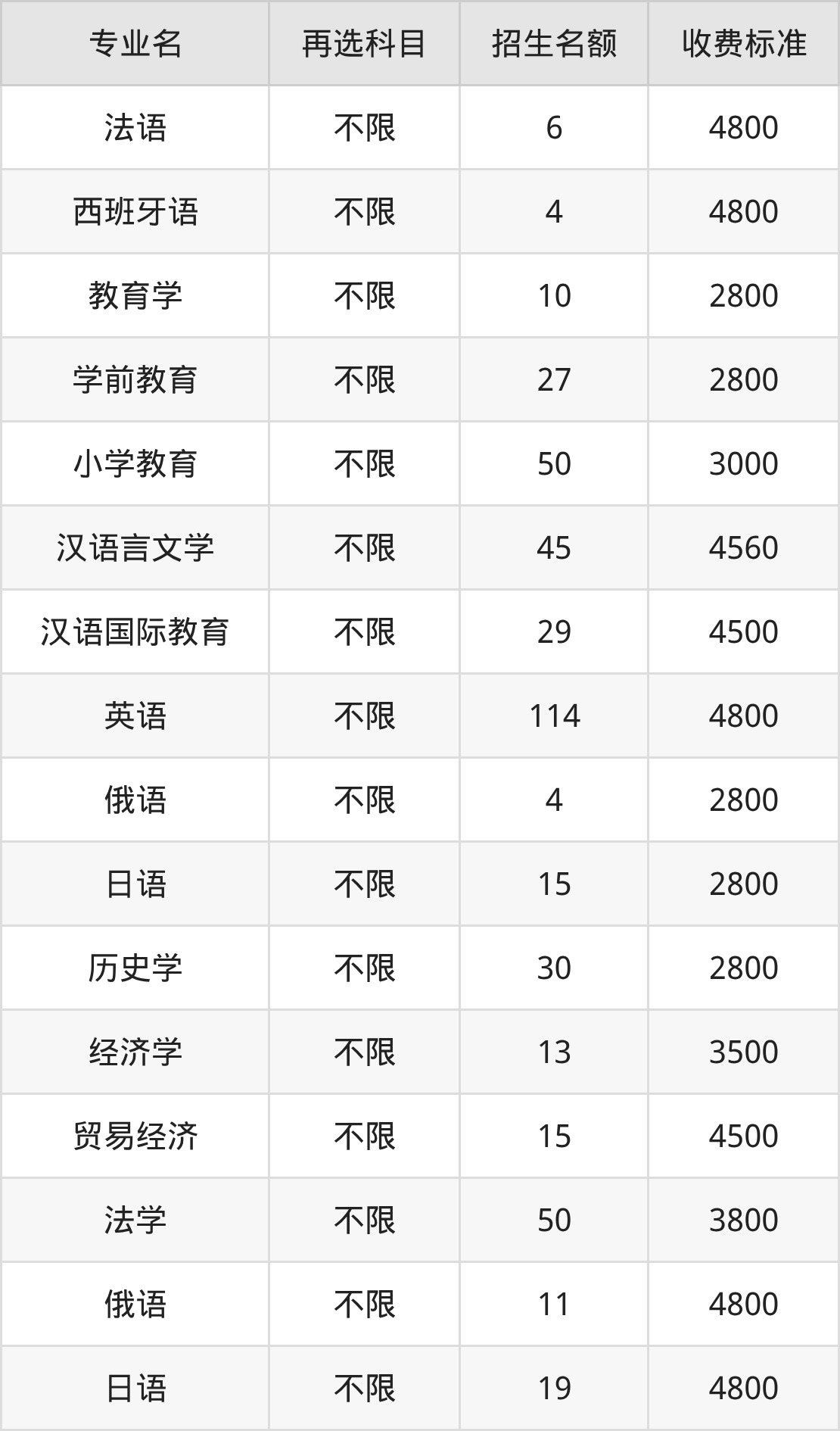 哈尔滨师范大学在历史组本科批招生的各个专业,每年的学费是2800元-8500元。招生人数最多的专业是英语,2025年招114人,学费是4800元。