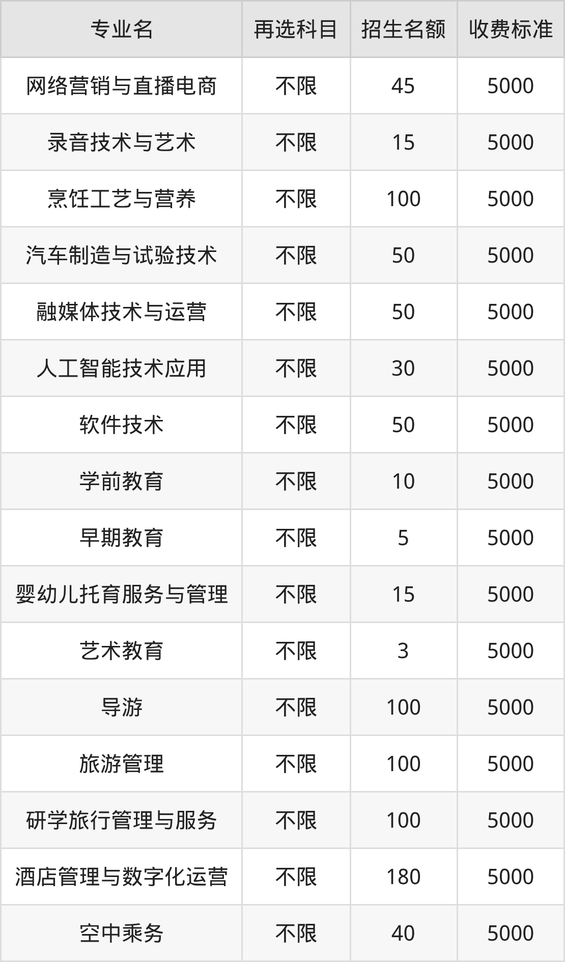 云南文化艺术职业学院在历史组高职专科批招生的各个专业,每年的学费是5000元。招生人数最多的专业是酒店管理与数字化运营,2025年招180人,学费是5000元。