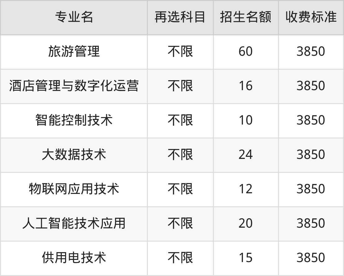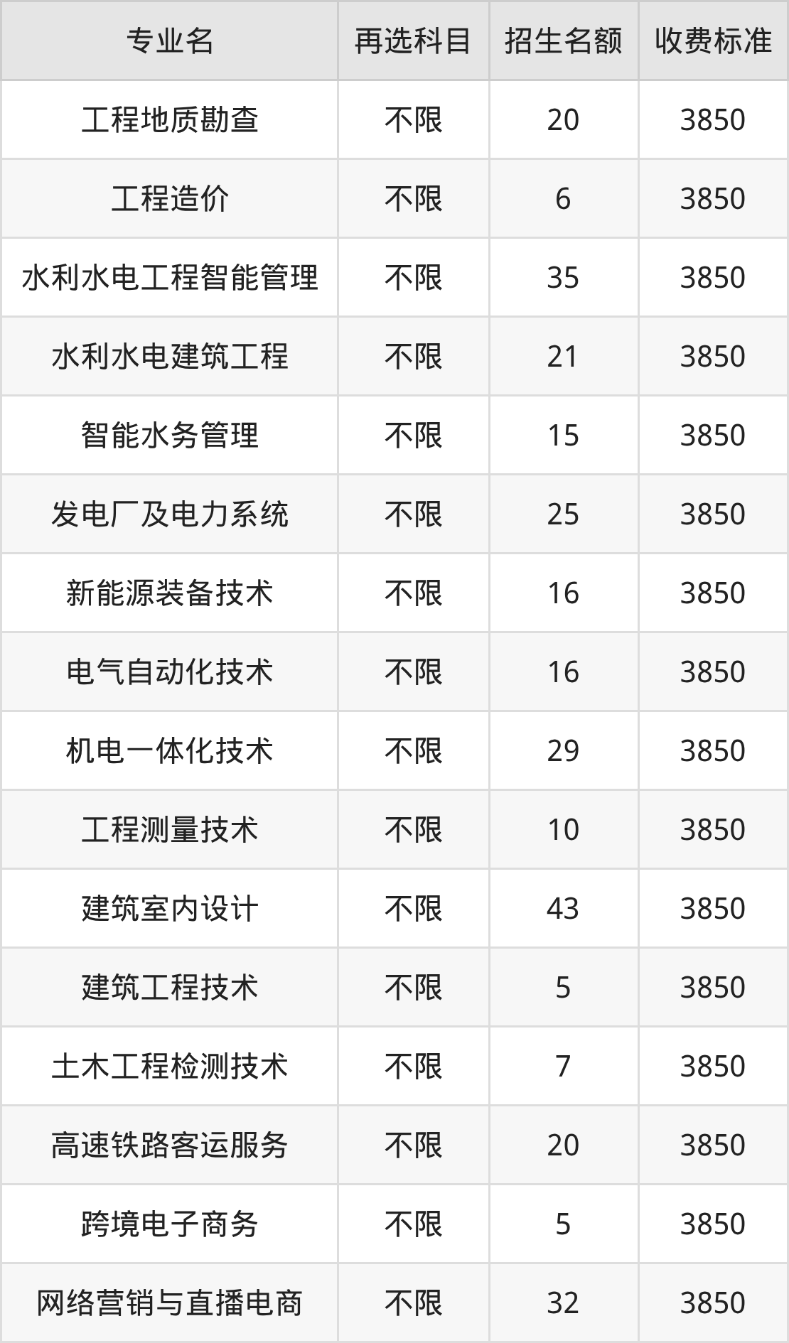 贵州水利水电职业技术学院在历史组高职专科批招生的各个专业,每年的学费是3850元。招生人数最多的专业是旅游管理,2025年招60人,学费是3850元。