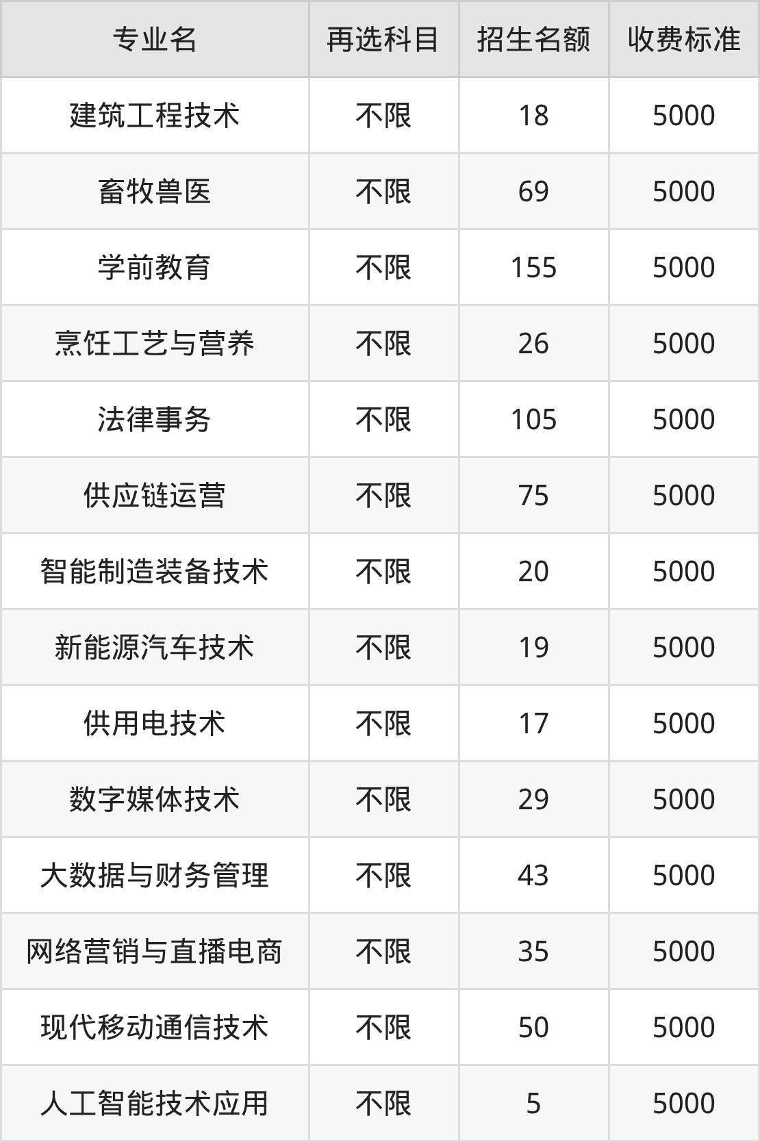 昭通职业学院在历史组高职专科批招生的各个专业,每年的学费是5000元。招生人数最多的专业是学前教育,2025年招155人,学费是5000元。