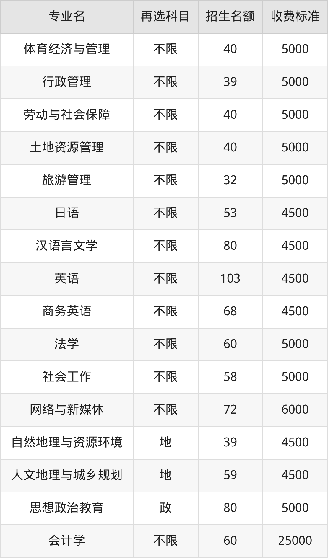 湖南财政经济学院在历史组本科批招生的各个专业,每年的学费是4500元-25000元。招生人数最多的专业是英语,2025年招103人,学费是4500元。