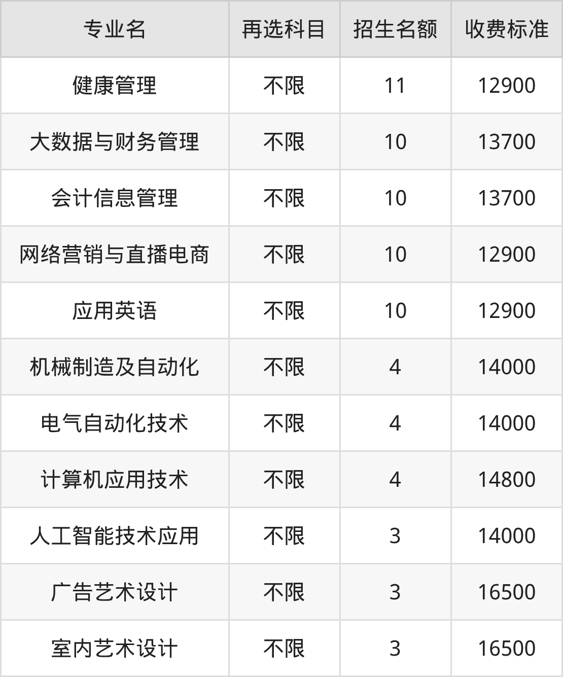 西安明德理工学院在历史组高职专科批招生的各个专业,每年的学费是12900元-16500元。招生人数最多的专业是健康管理,2025年招11人,学费是12900元。
