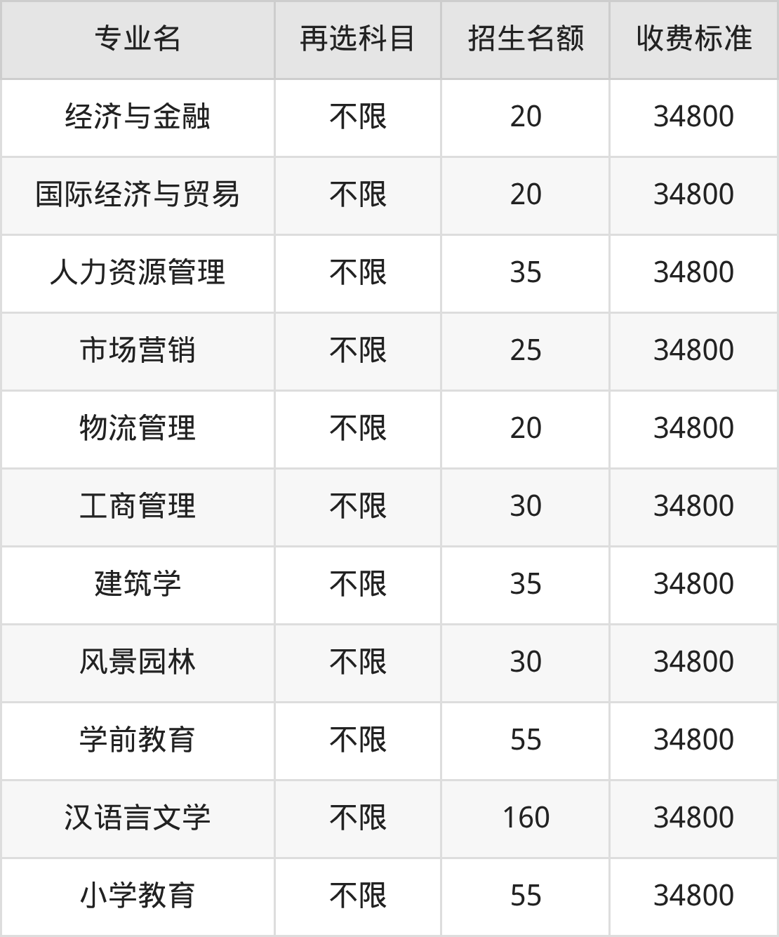 广州华立学院在历史组本科批招生的各个专业,每年的学费是34800元-42800元。招生人数最多的专业是汉语言文学,2025年招160人,学费是34800元。