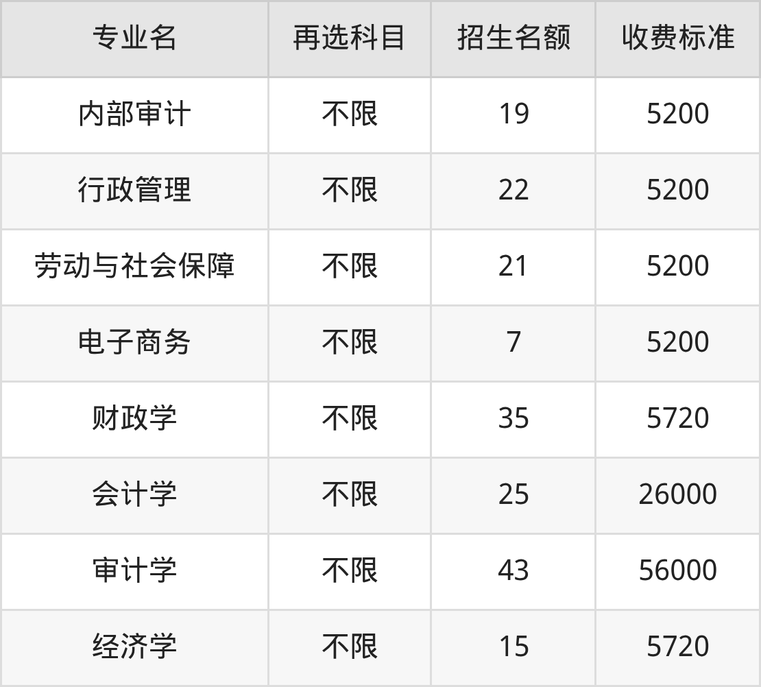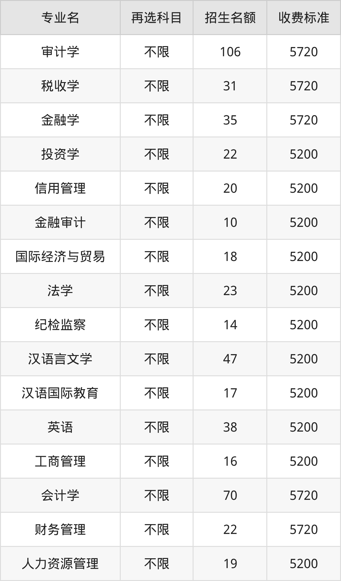 南京审计大学在历史组本科批招生的各个专业,每年的学费是5200元-56000元。招生人数最多的专业是审计学,2025年招106人,学费是5720元。