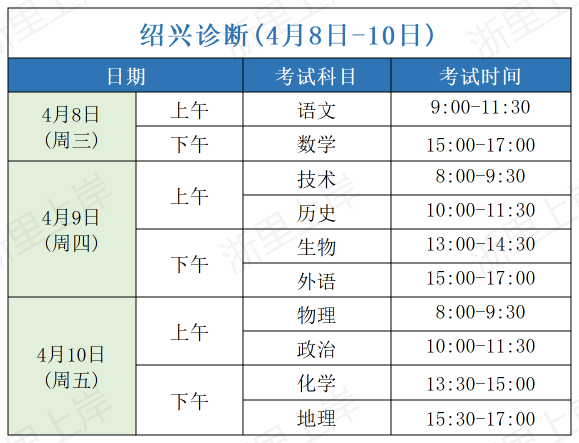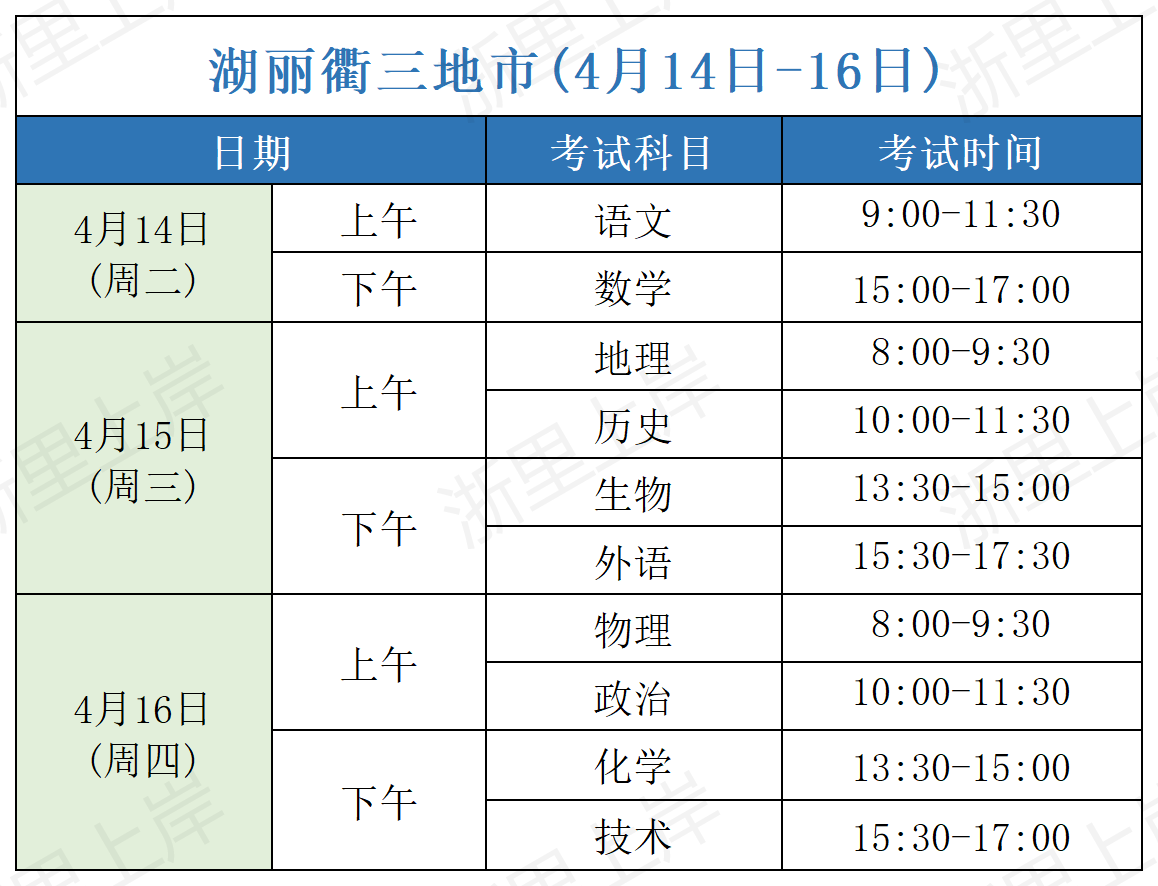 这四个地区的考试时间均为4月8日(周三)至4月10日(周五),但具体科目排布有所不同。