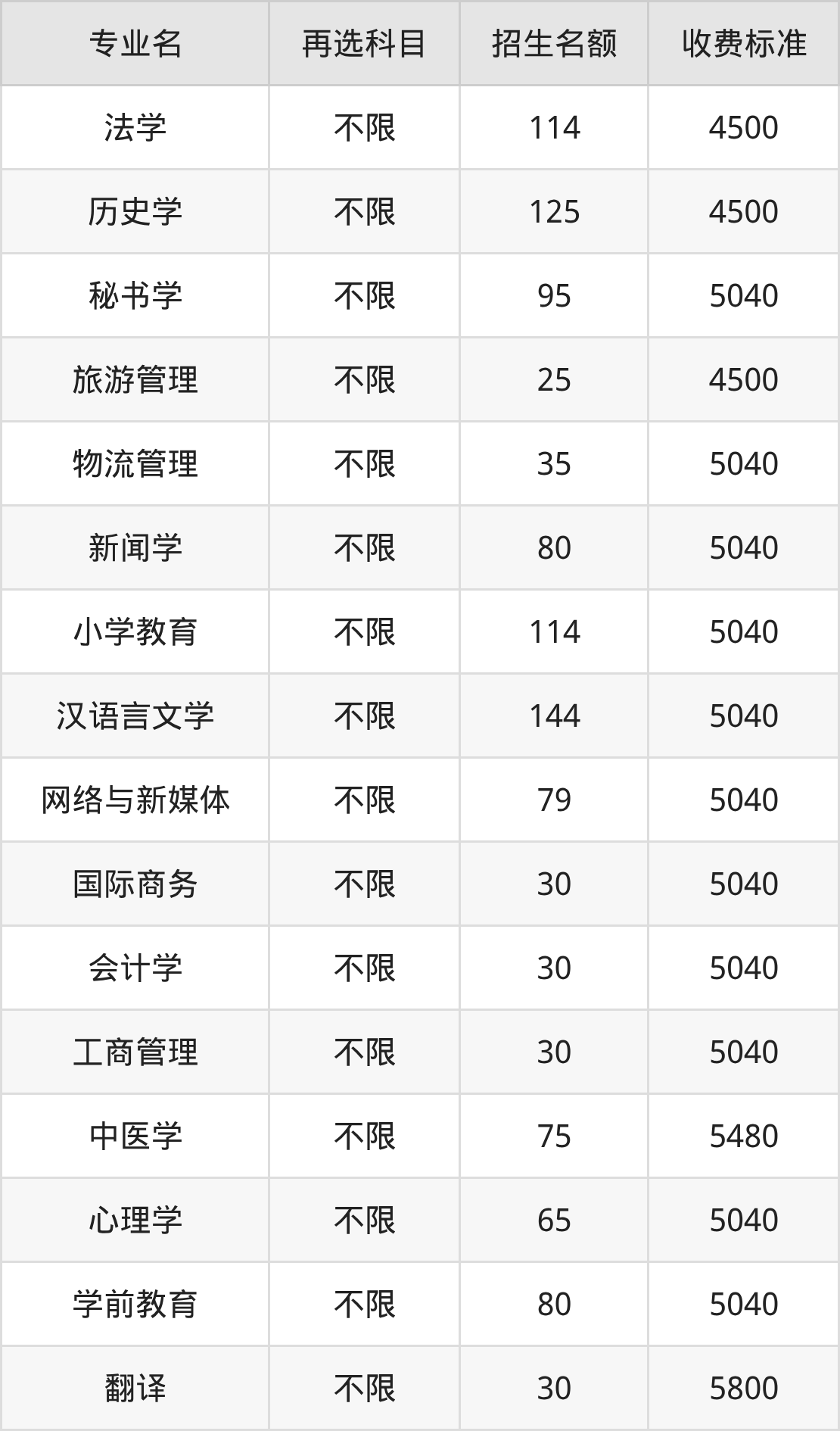 | 本科批 | 历史 | 法学 | 114 |