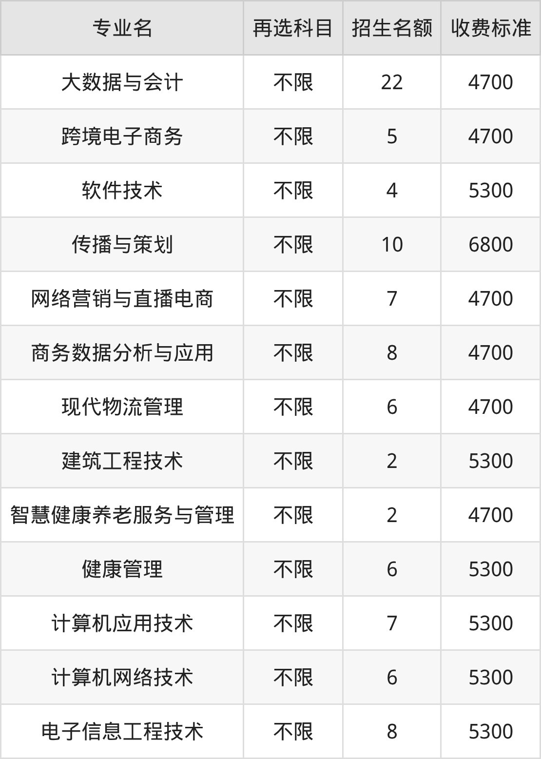 南京城市职业学院在历史组专科批招生的各个专业,每年的学费是4700元-6800元。招生人数最多的专业是大数据与会计,2025年招22人,学费是4700元。