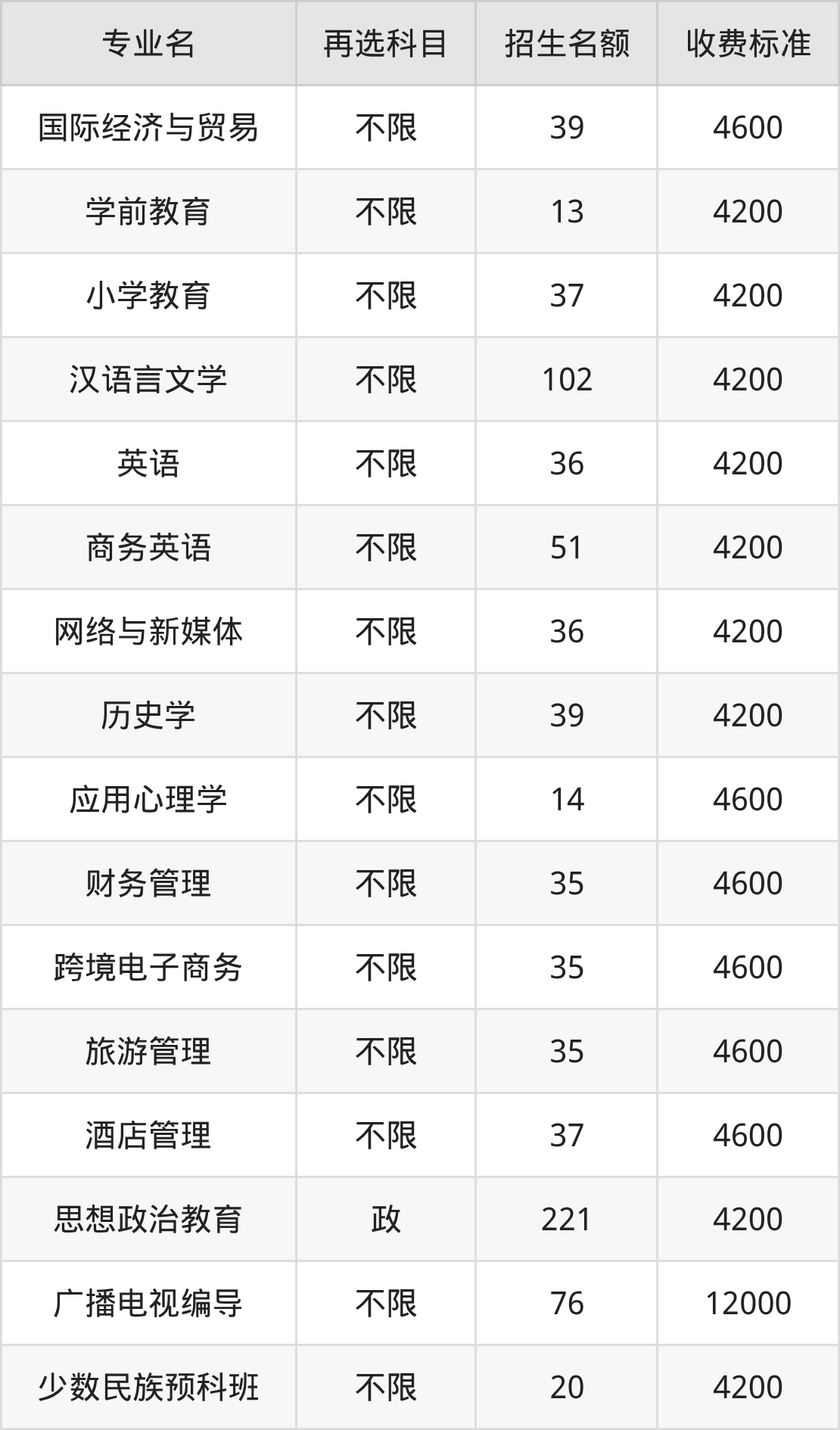 贺州学院在历史组本科批招生的各个专业,每年的学费是4200元-12000元。招生人数最多的专业是思想政治教育,2025年招221人,学费是4200元。