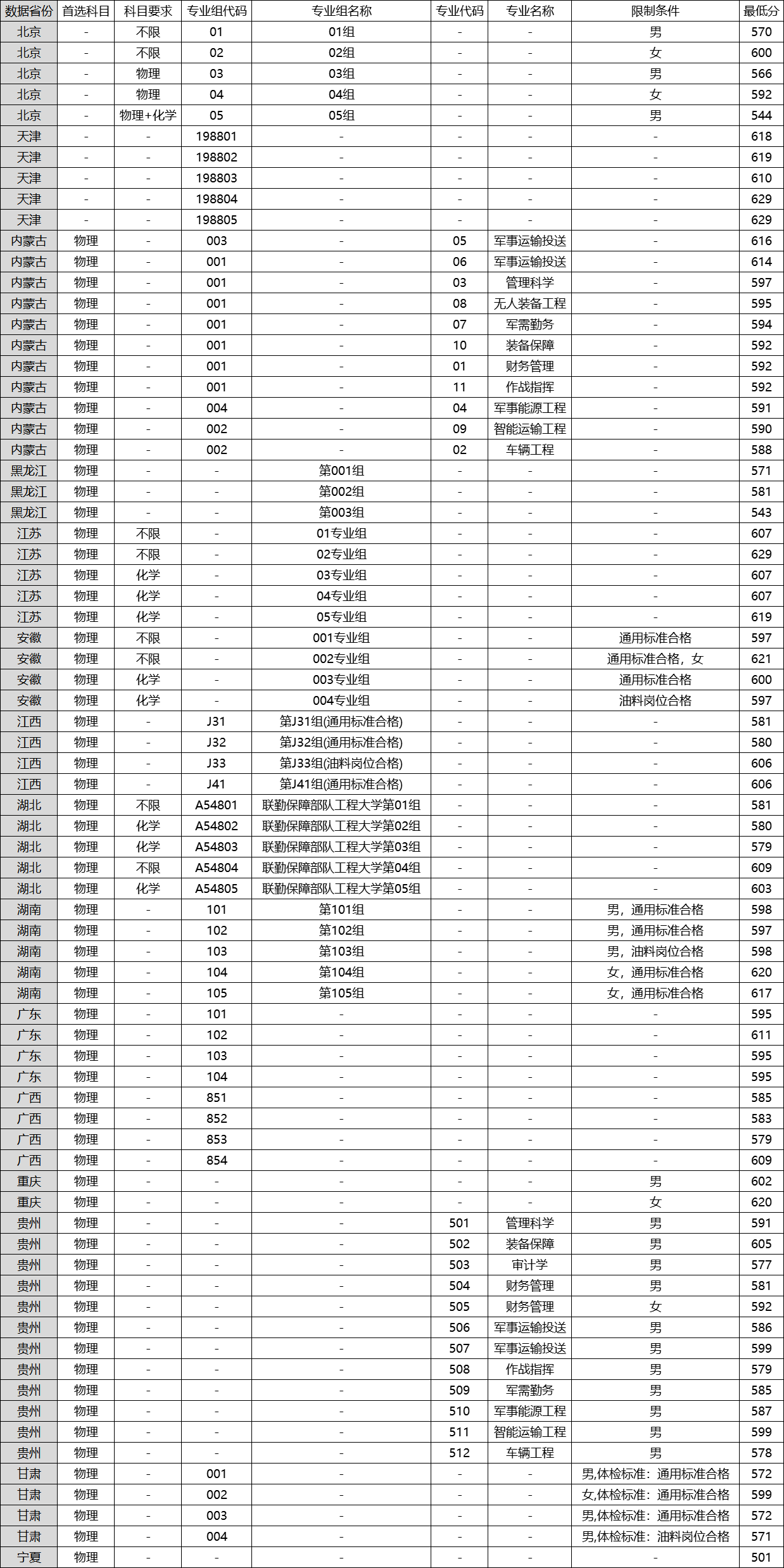 性别差异与女生竞争:在公布性别的省份,女生录取分数普遍高于男生,符合军队院校普遍规律。例如:
