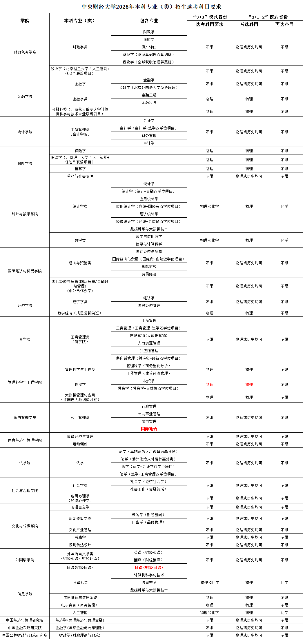 2026中央财经大学本科各专业选考科目要求具体如下: