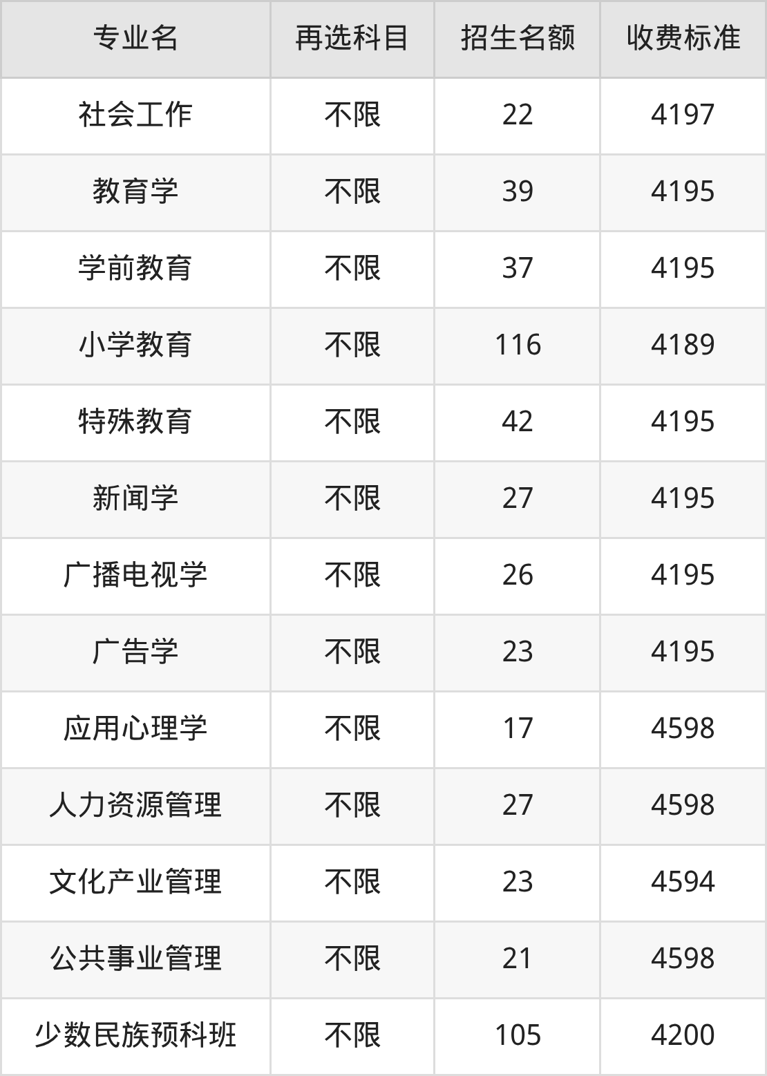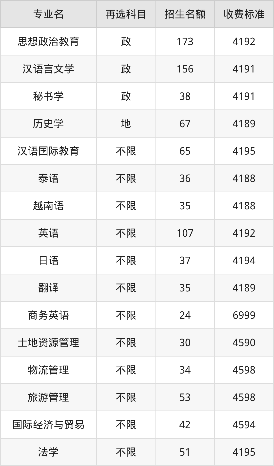 南宁师范大学在历史组本科批招生的各个专业,每年的学费是4188元-6999元。招生人数最多的专业是思想政治教育,2025年招173人,学费是4192元。