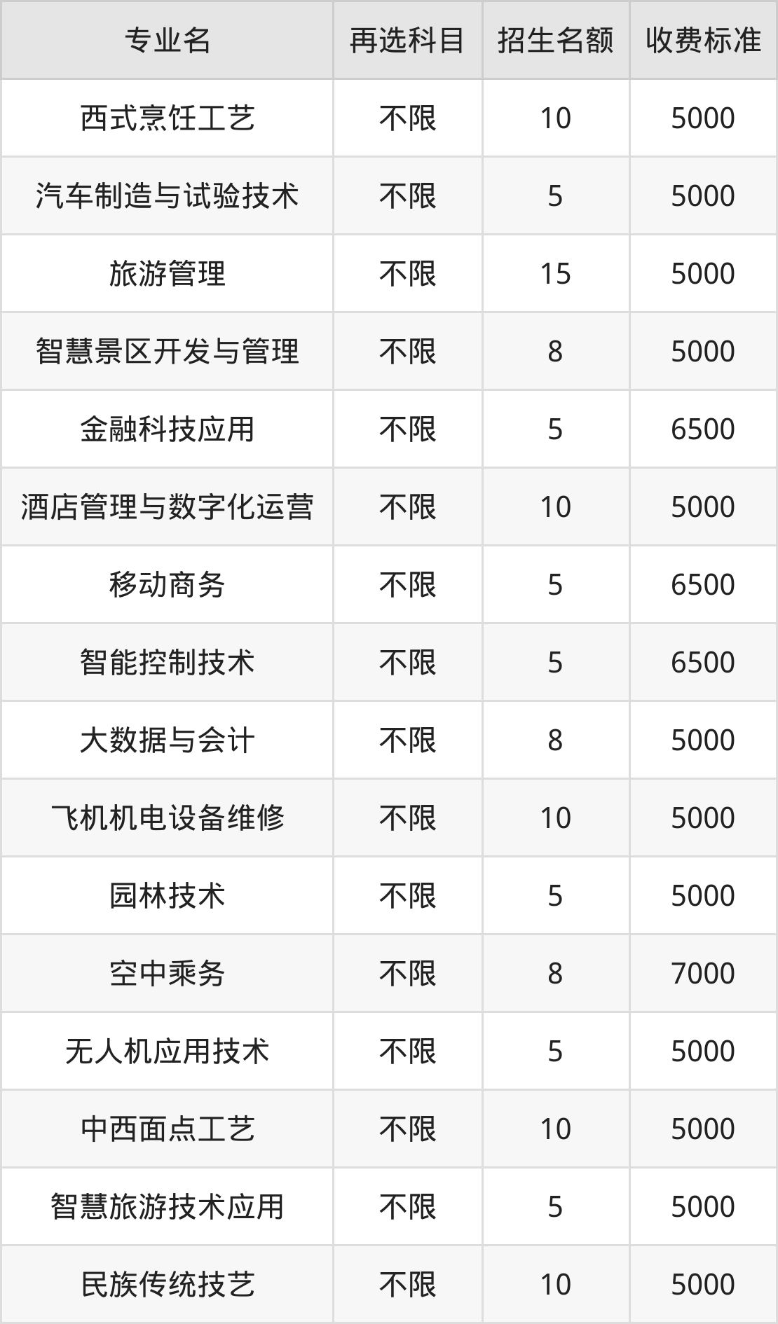 | 高职专科批 | 历史 | 西式烹饪工艺 | 10 |