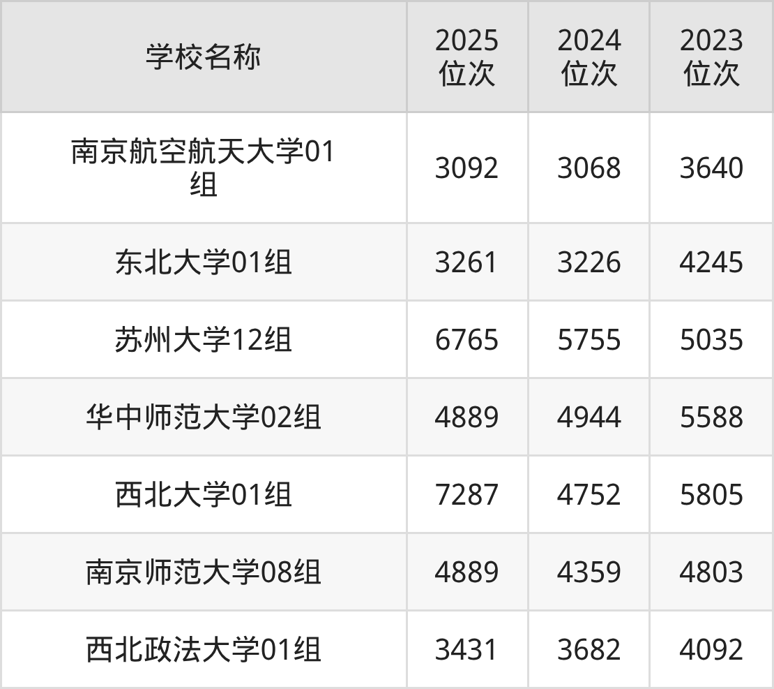 南京航空航天大学01组:2025年的最低分位次是3092名,2024年是3068名,2023年是3640名。招生专业包含:会计学、行政管理、英语、法学、广播电视学、工商管理、金融学。