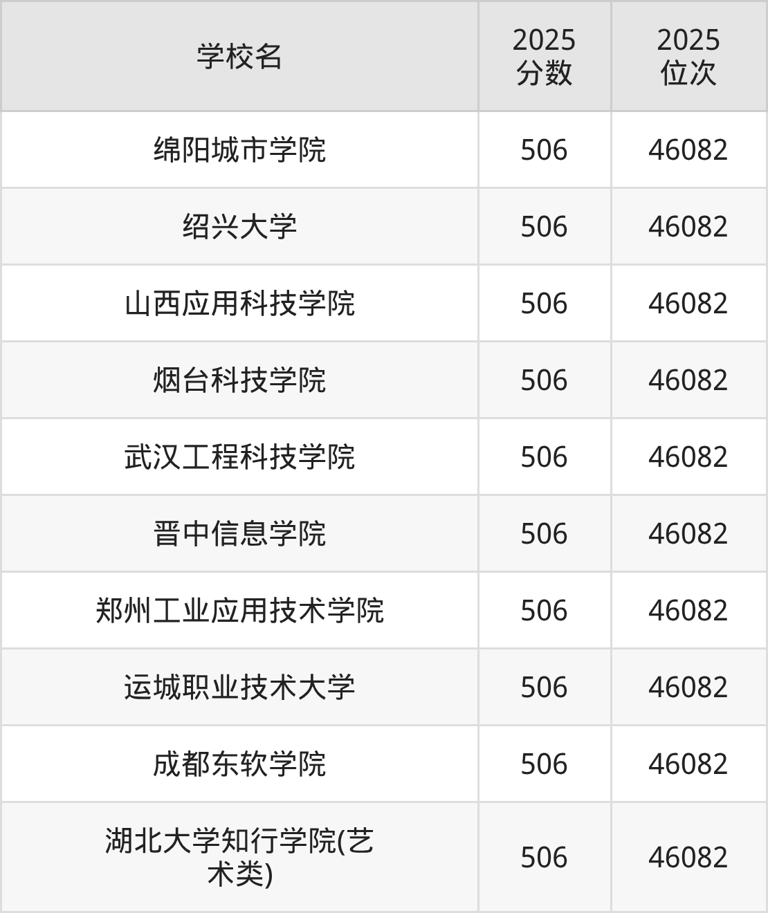 包含:绵阳城市学院、绍兴大学、山西应用科技学院、烟台科技学院、武汉工程科技学院、晋中信息学院、郑州工业应用技术学院、运城职业技术大学、成都东软学院、湖北大学知行学院(艺术类)。