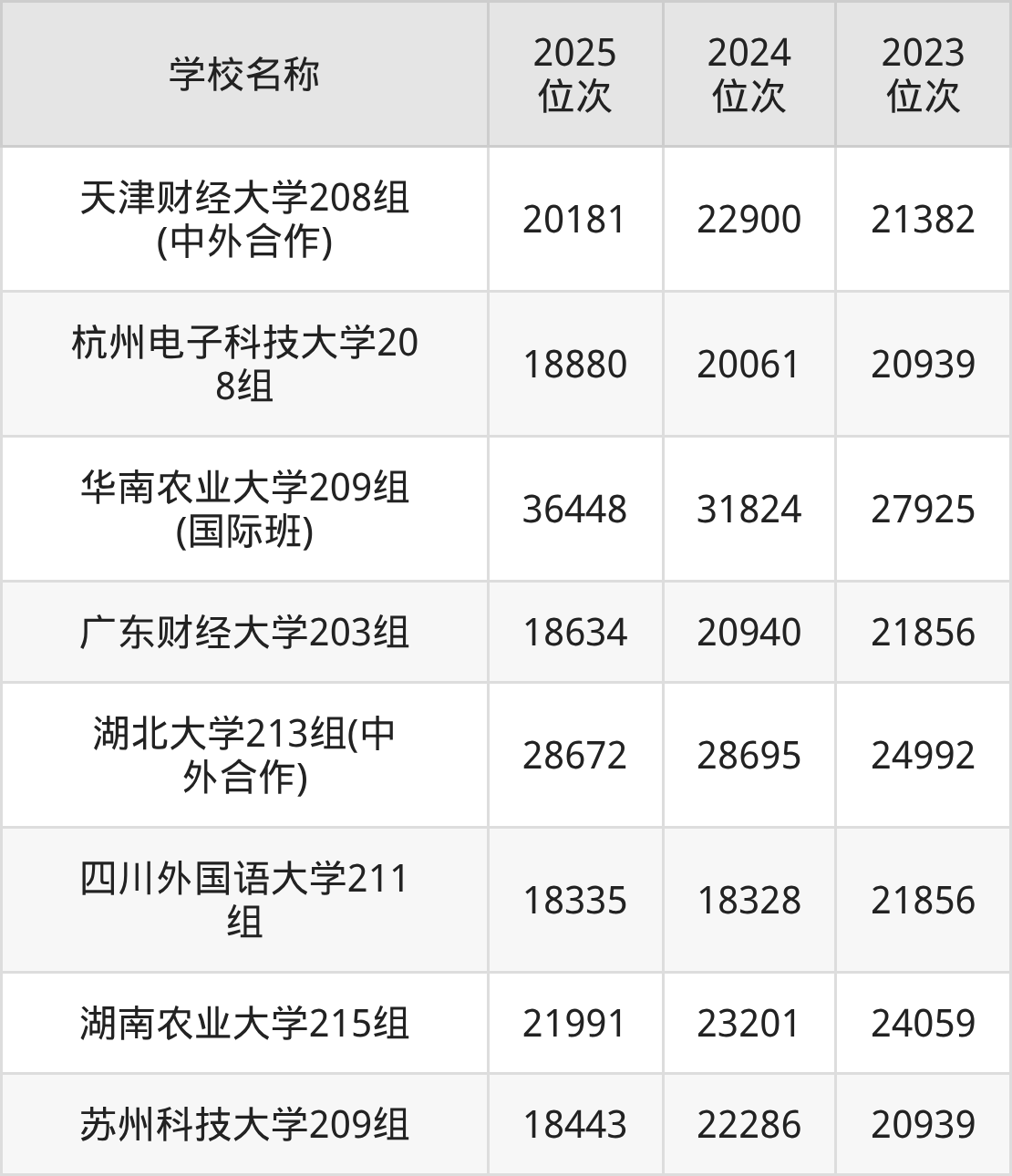 天津财经大学208组(中外合作):2025年的最低分位次是20181名,2024年是22900名,2023年是21382名。招生专业包含:金融学。