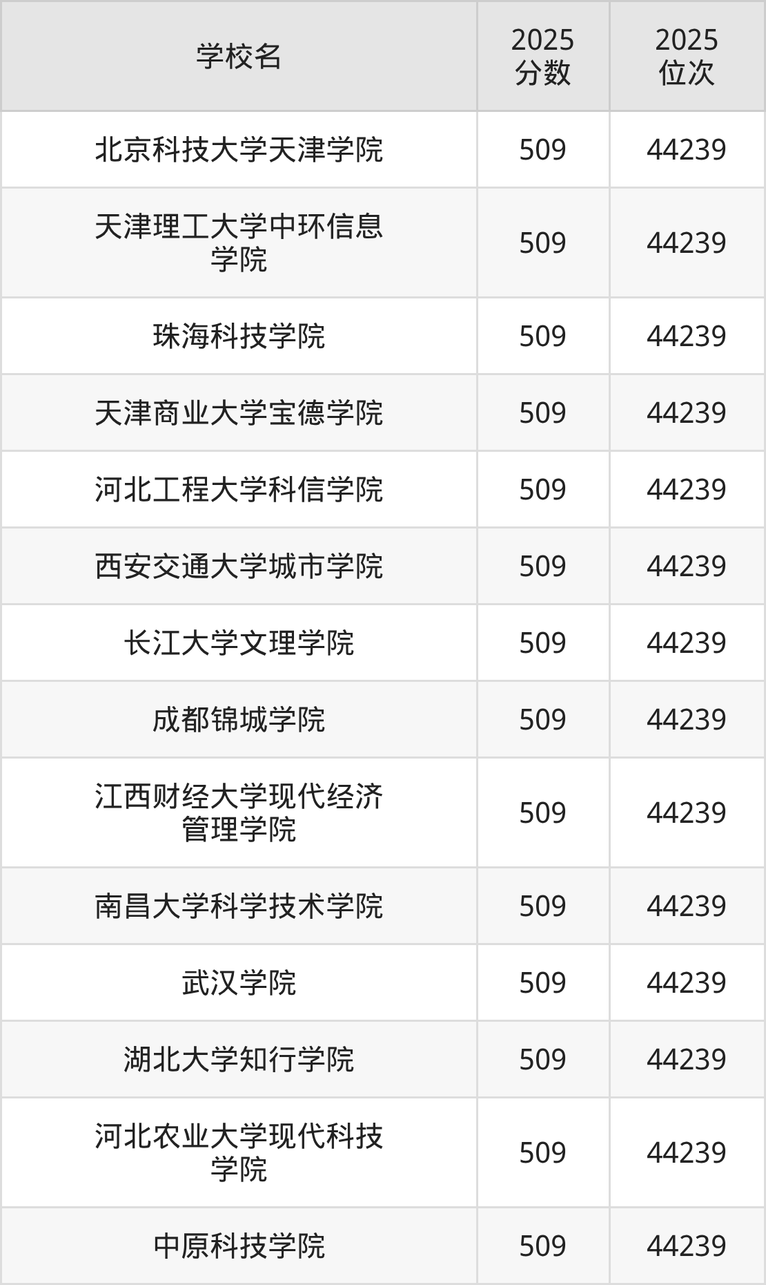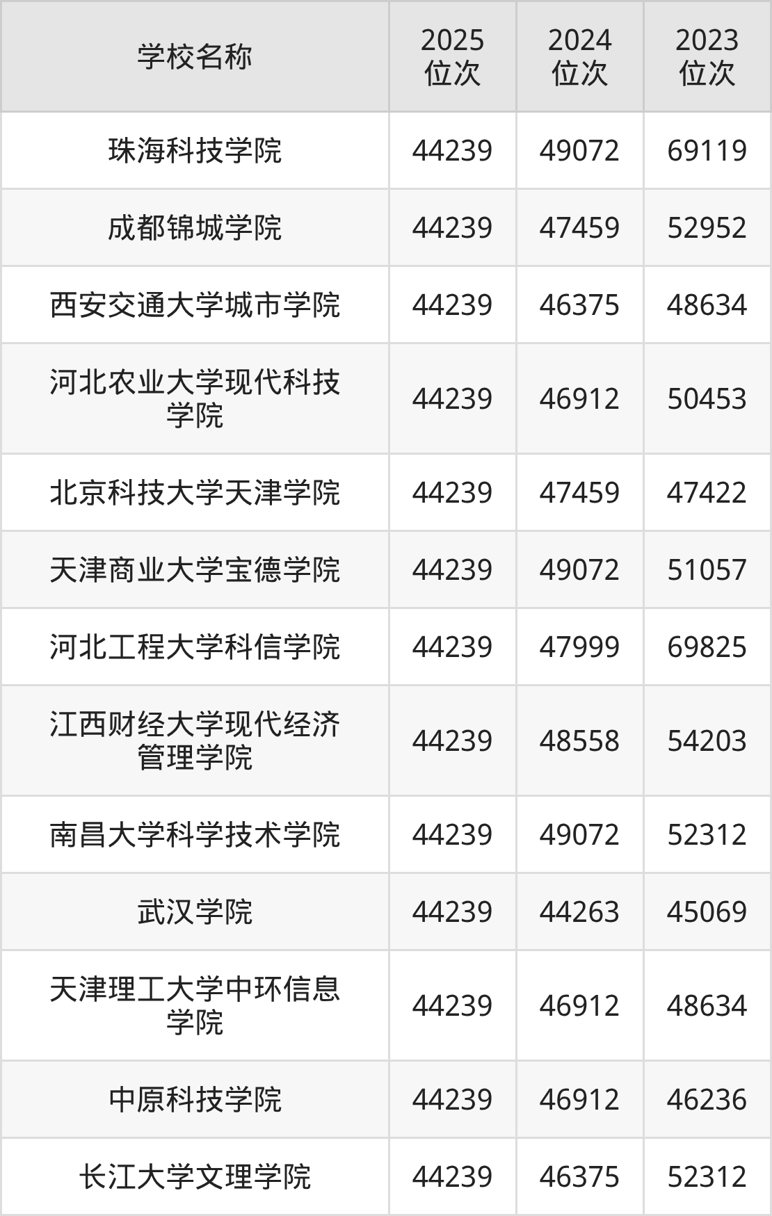 珠海科技学院:2025年的最低分位次是44239名,2024年是49072名,2023年是69119名。招生专业包含:金融学、投资学、社会工作、汉语言文学、广告学、会计学、财务管理、人力资源管理。