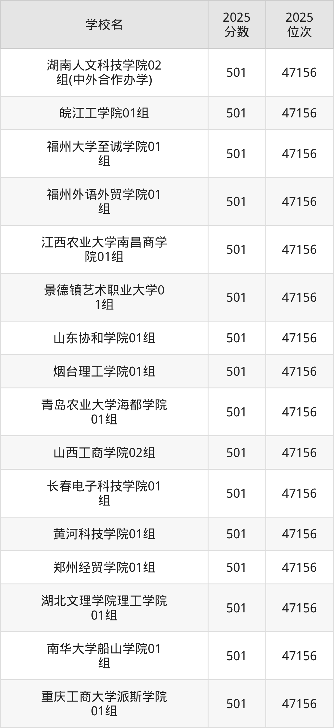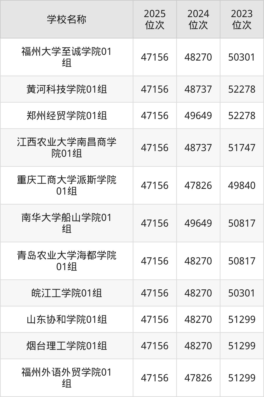 福州大学至诚学院01组:2025年的最低分位次是47156名,2024年是48270名,2023年是50301名。招生专业包含:财务管理、汉语言文学、建筑学、网络与新媒体、物流管理。