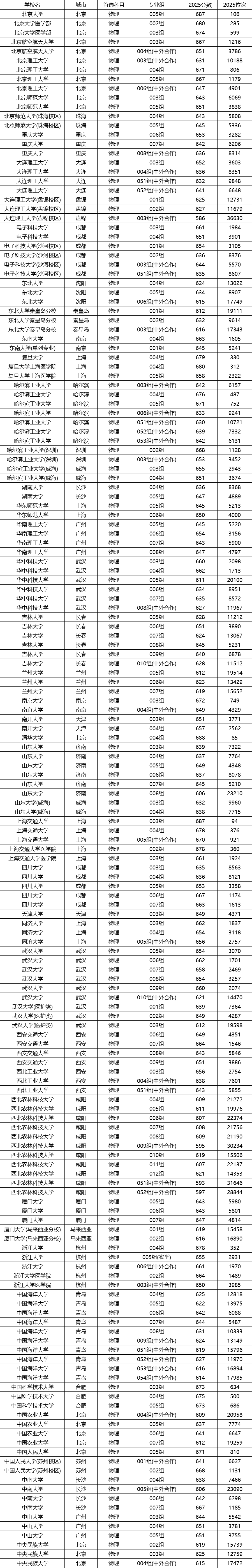2025年,物理类985高校的录取分数呈现“两头尖、中间宽”的分布特点。顶尖院校如清华大学、北京大学、上海交通大学和复旦大学,分数普遍在670分以上。
