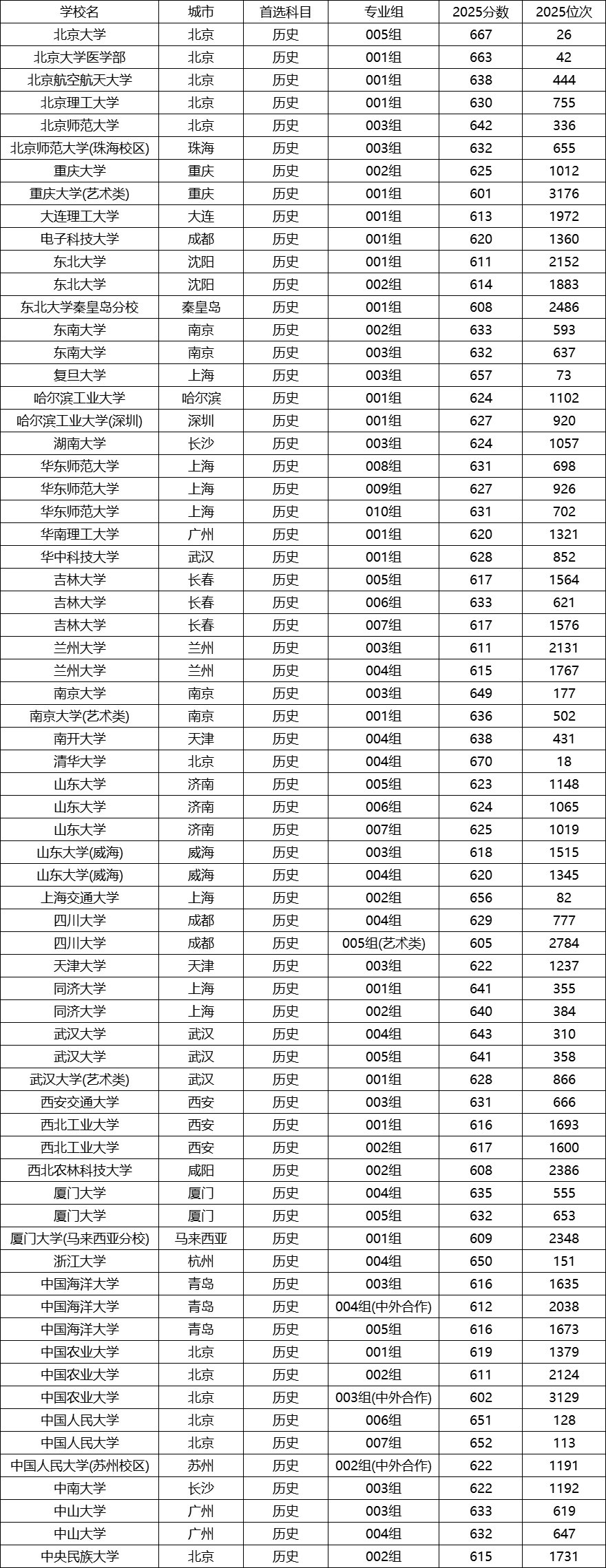 历史类985录取分数同样呈现梯度分布。顶尖院校如清华大学、北京大学、中国人民大学和南京大学,分数在650分以上。