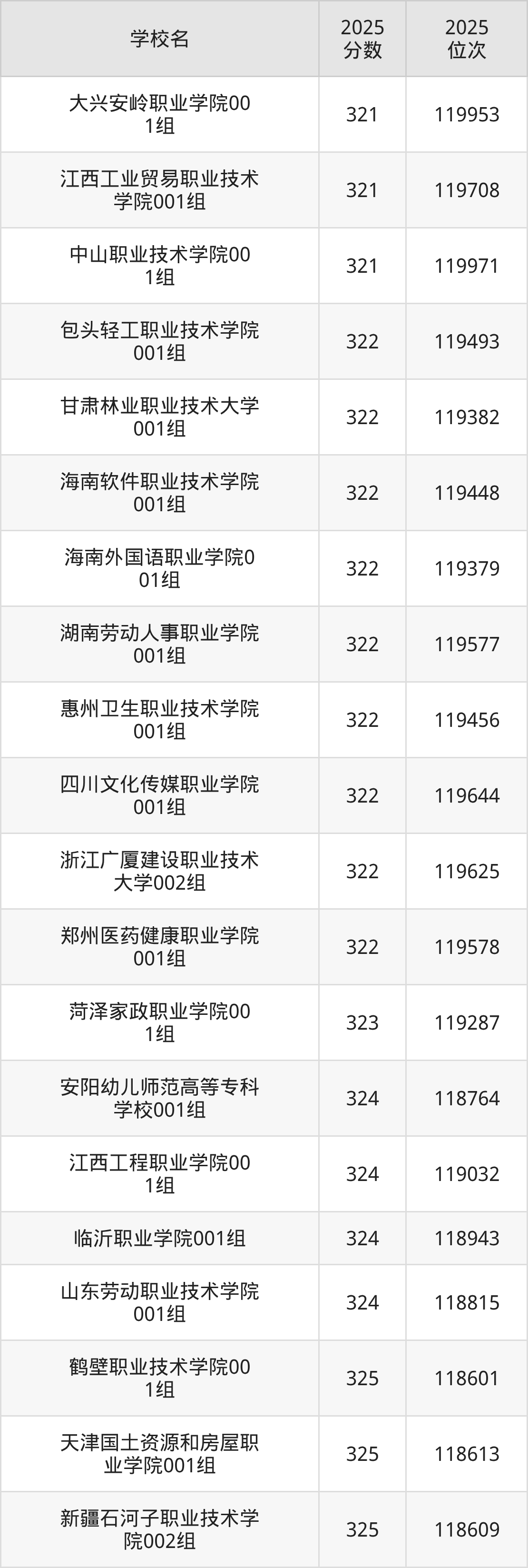 包含:大兴安岭职业学院、江西工业贸易职业技术学院、中山职业技术学院、包头轻工职业技术学院、甘肃林业职业技术大学、海南软件职业技术学院、海南外国语职业学院、湖南劳动人事职业学院、惠州卫生职业技术学院、四川文化传媒职业学院。