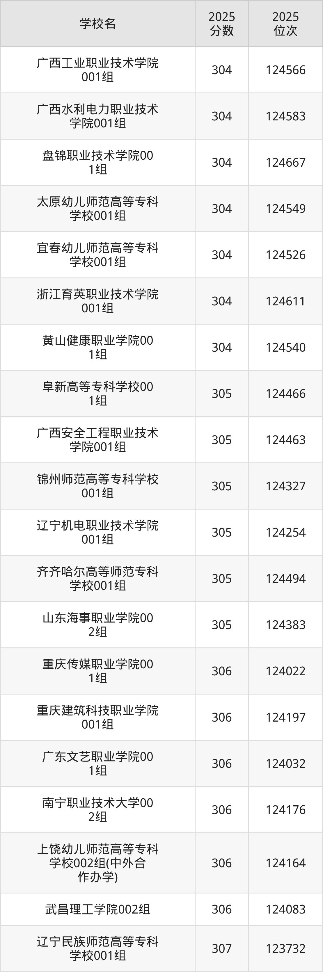 包含:广西工业职业技术学院、广西水利电力职业技术学院、盘锦职业技术学院、太原幼儿师范高等专科学校、宜春幼儿师范高等专科学校、浙江育英职业技术学院、黄山健康职业学院、阜新高等专科学校、广西安全工程职业技术学院、锦州师范高等专科学校。