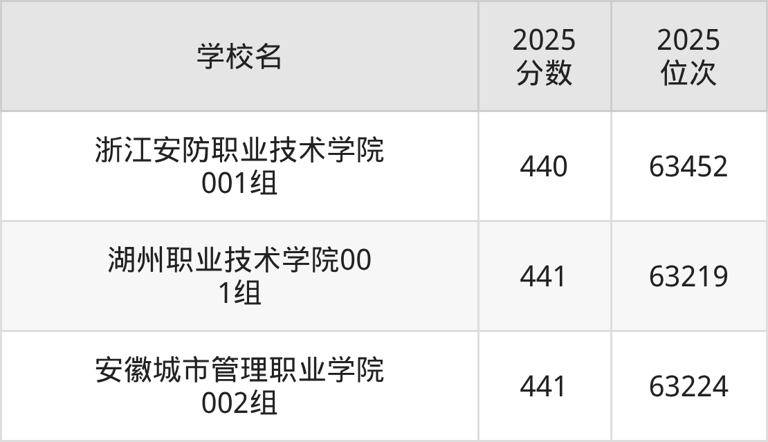 包含:浙江安防职业技术学院、湖州职业技术学院、安徽城市管理职业学院。